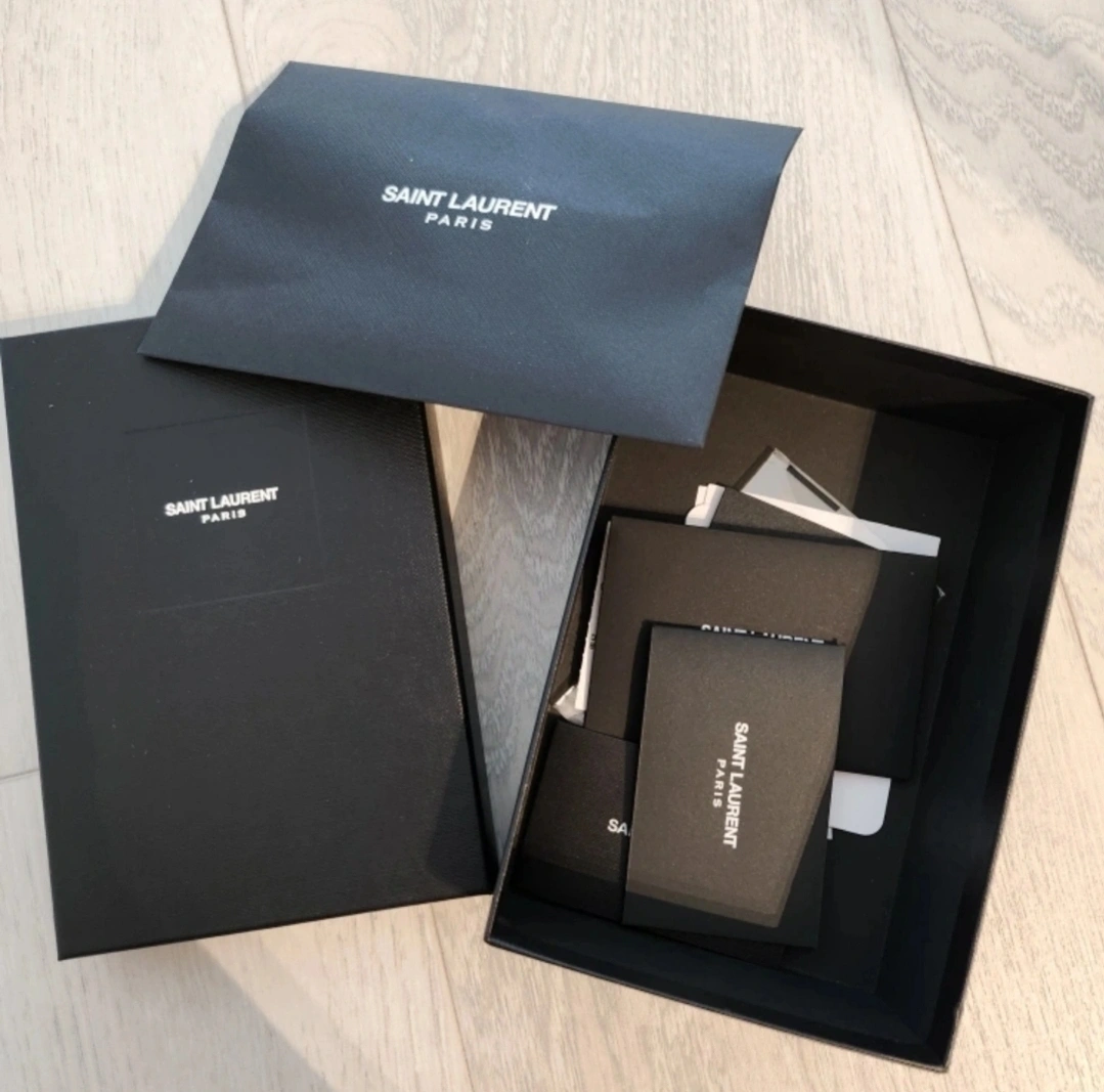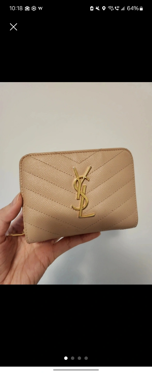 Compact zip-around wallet. Beige leather. Gold-toned YSL logo. Includes original box and dust bag. Multiple card slots and compartments.