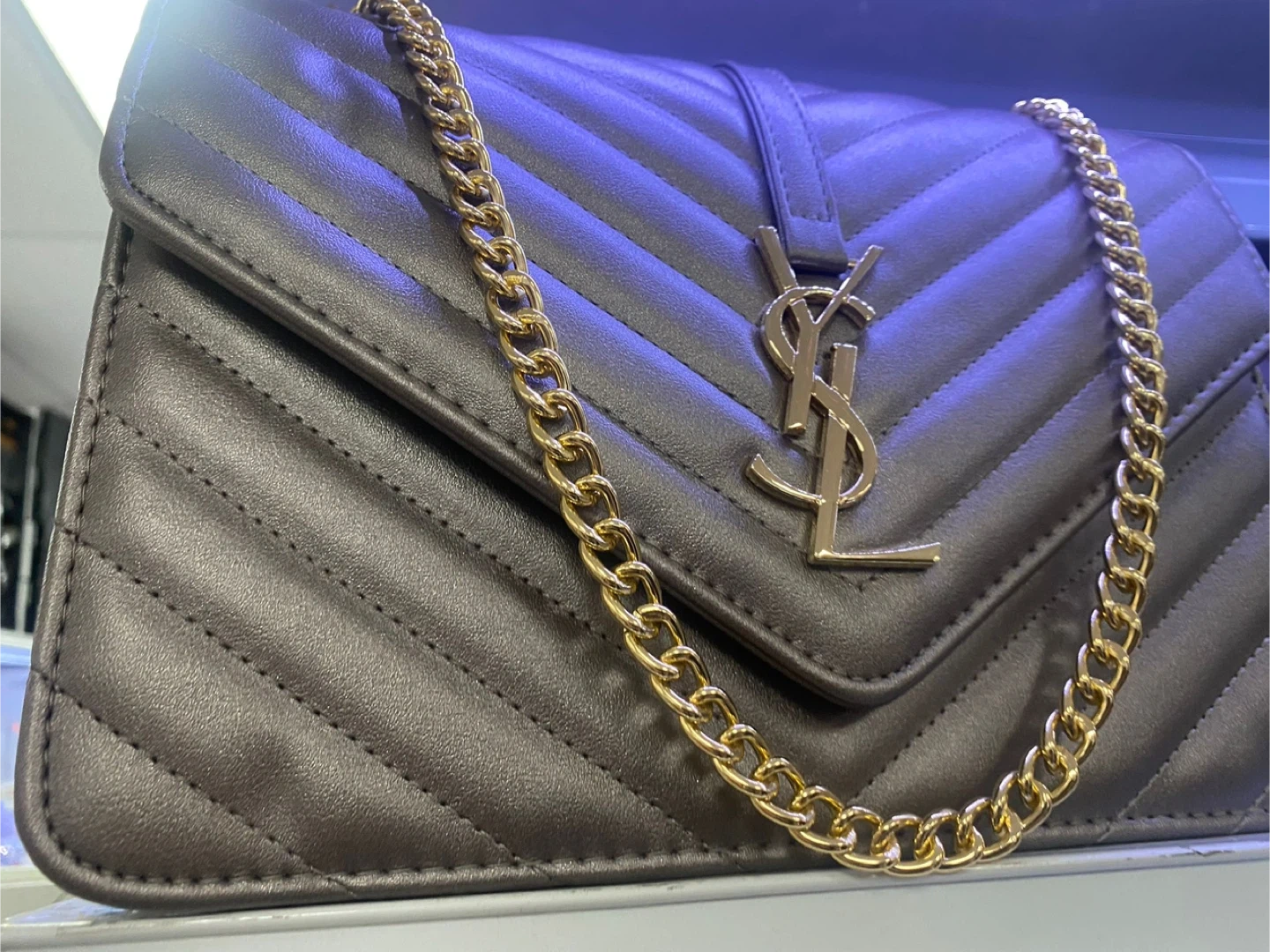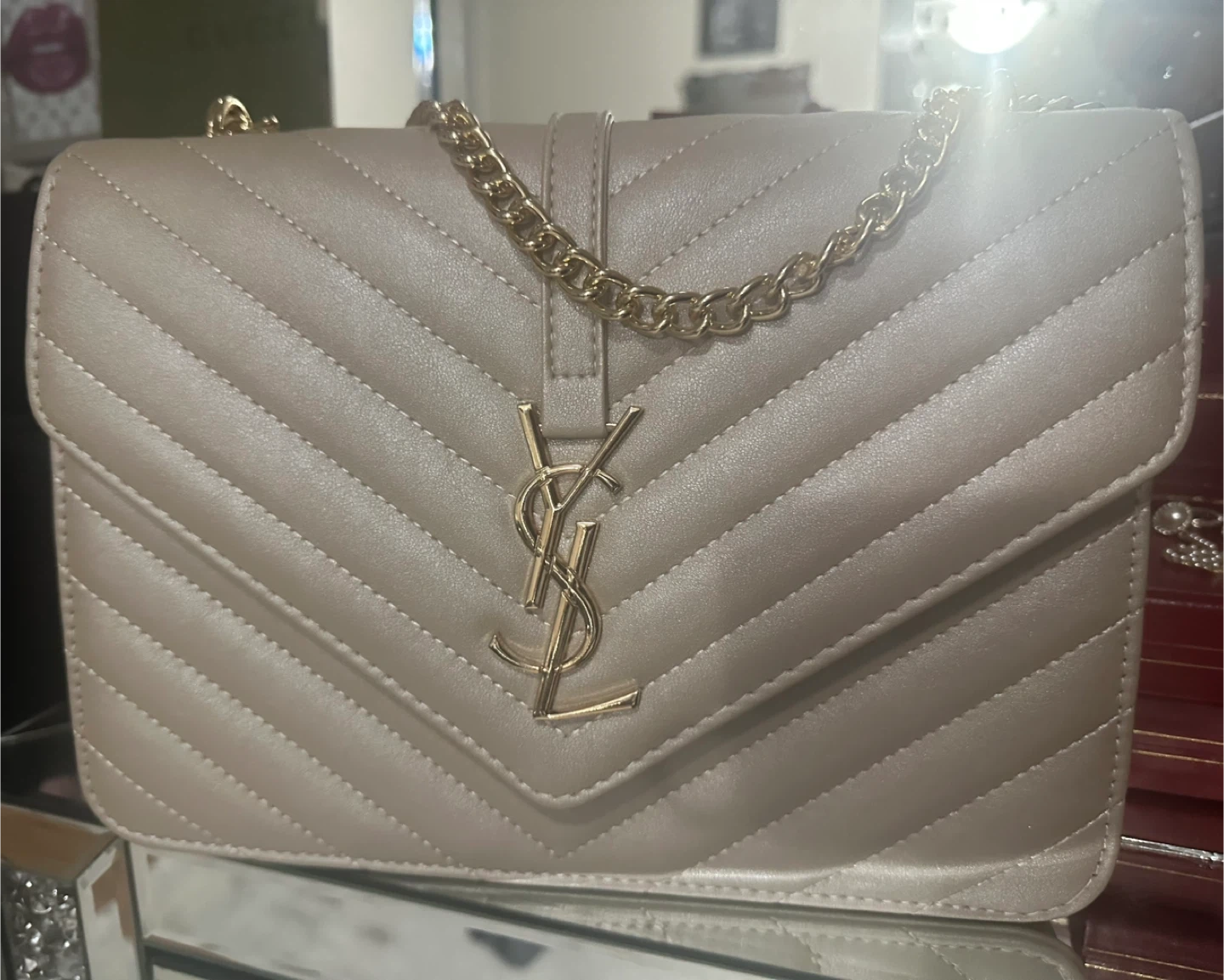 It's in great condition and features a classic beige design with a gold chain strap and the iconic YSL logo.each for$47