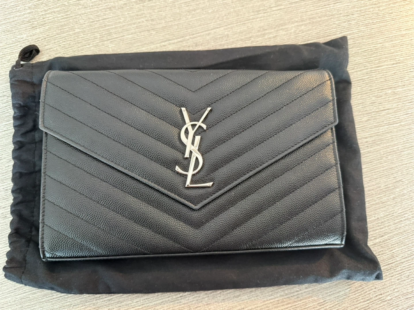 79Selling a beautiful Saint Laurent leather wallet on chain in black! It's in great condition and comes with its original dust bag. The wallet features the iconic YSL logo and a chain strap, perfect for carrying your essentials in style! Regular price $2300 Selling for $1200