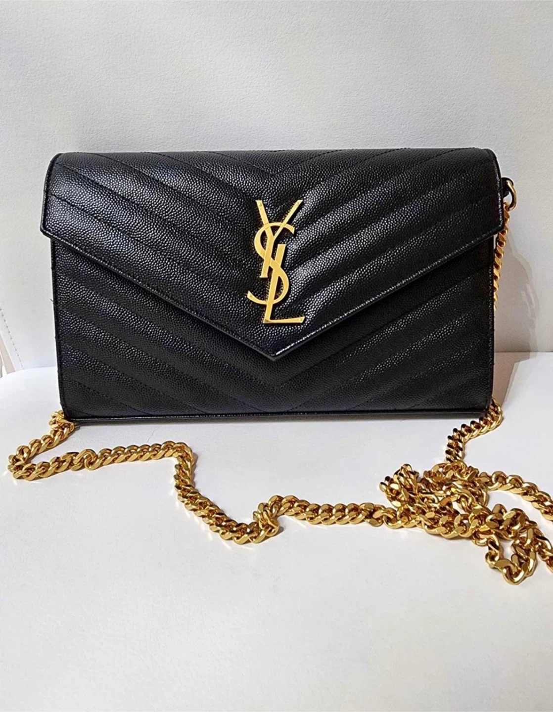 Selling a beautiful Saint Laurent (YSL) wallet on chain. It's a stylish black leather with the iconic YSL logo and a gold chain. Perfect for evenings out or when you want to travel light!