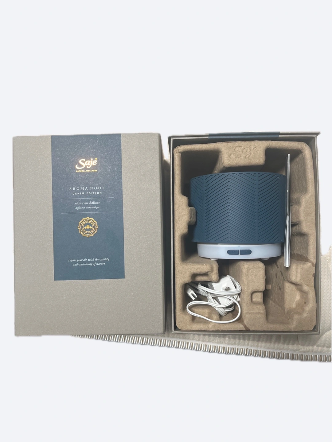 Selling a Saje Aroma Nook Denim Edition ultrasonic diffuser. It's in excellent condition and comes with the original box and components. This diffuser is designed to infuse your air with vitality and well-being. Perfect for creating a relaxing atmosphere in your home!