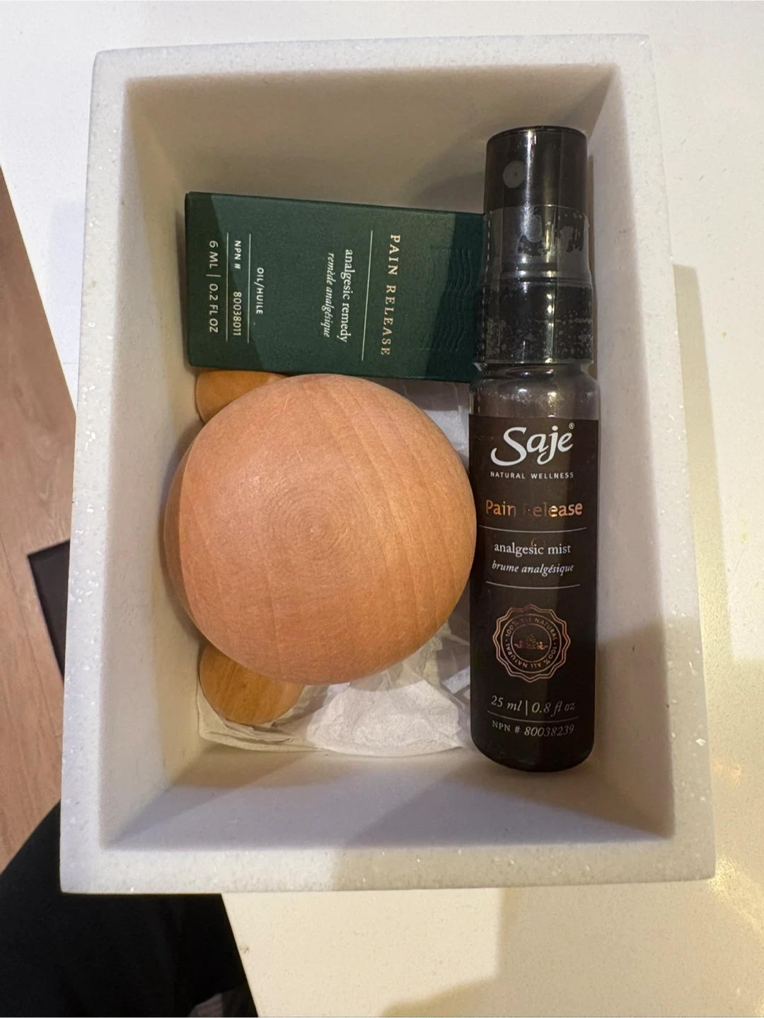 1000+Selling a Saje Pain Release kit. It includes analgesic remedy, analgesic mist, and a wooden ball massager. Perfect for relieving tension and soothing sore muscles. Comes in a nice stone box. Brand new. Great for gifts. Originally $50.