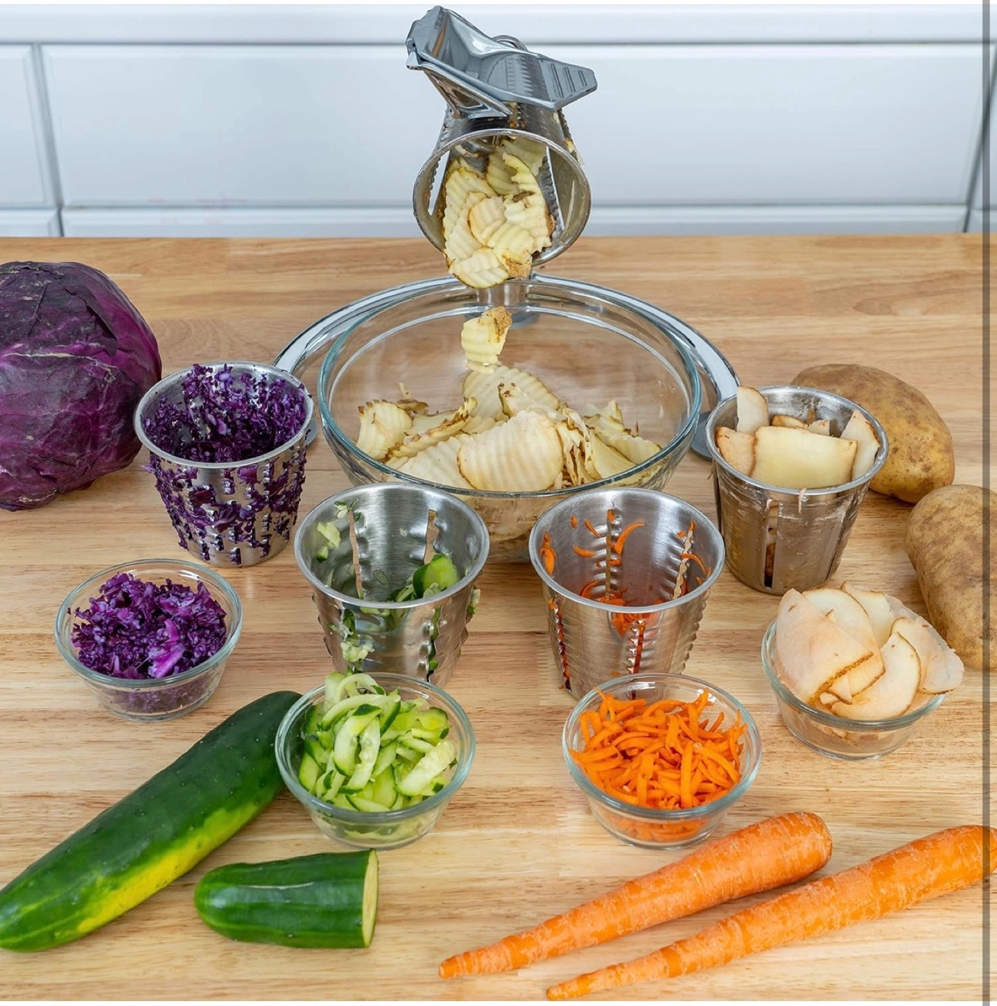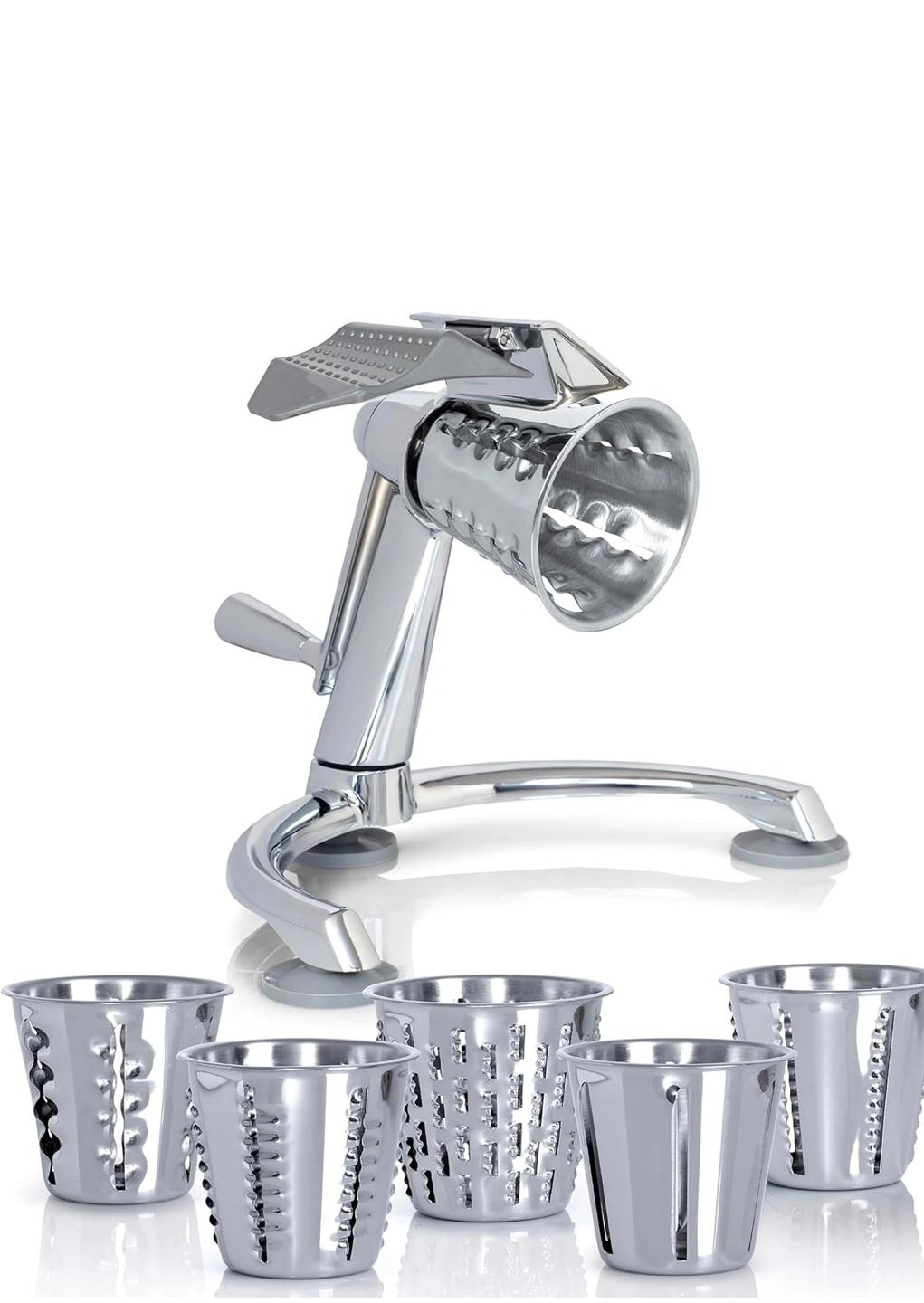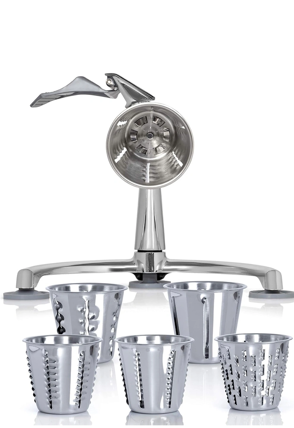 Manual vegetable chopper. Five interchangeable stainless steel drums. Durable construction. Easy to use and clean. Perfect for preparing salads and other dishes.
