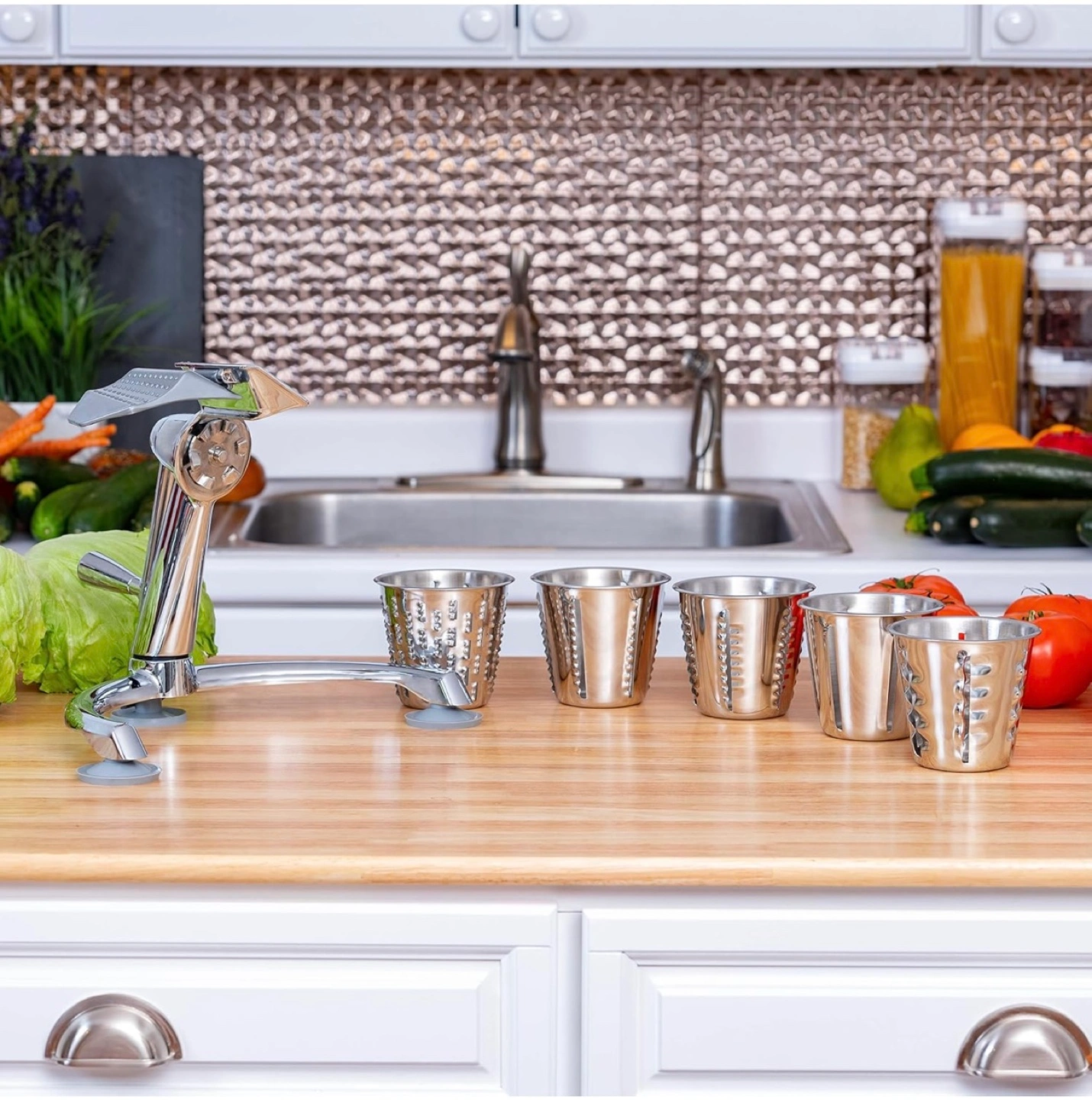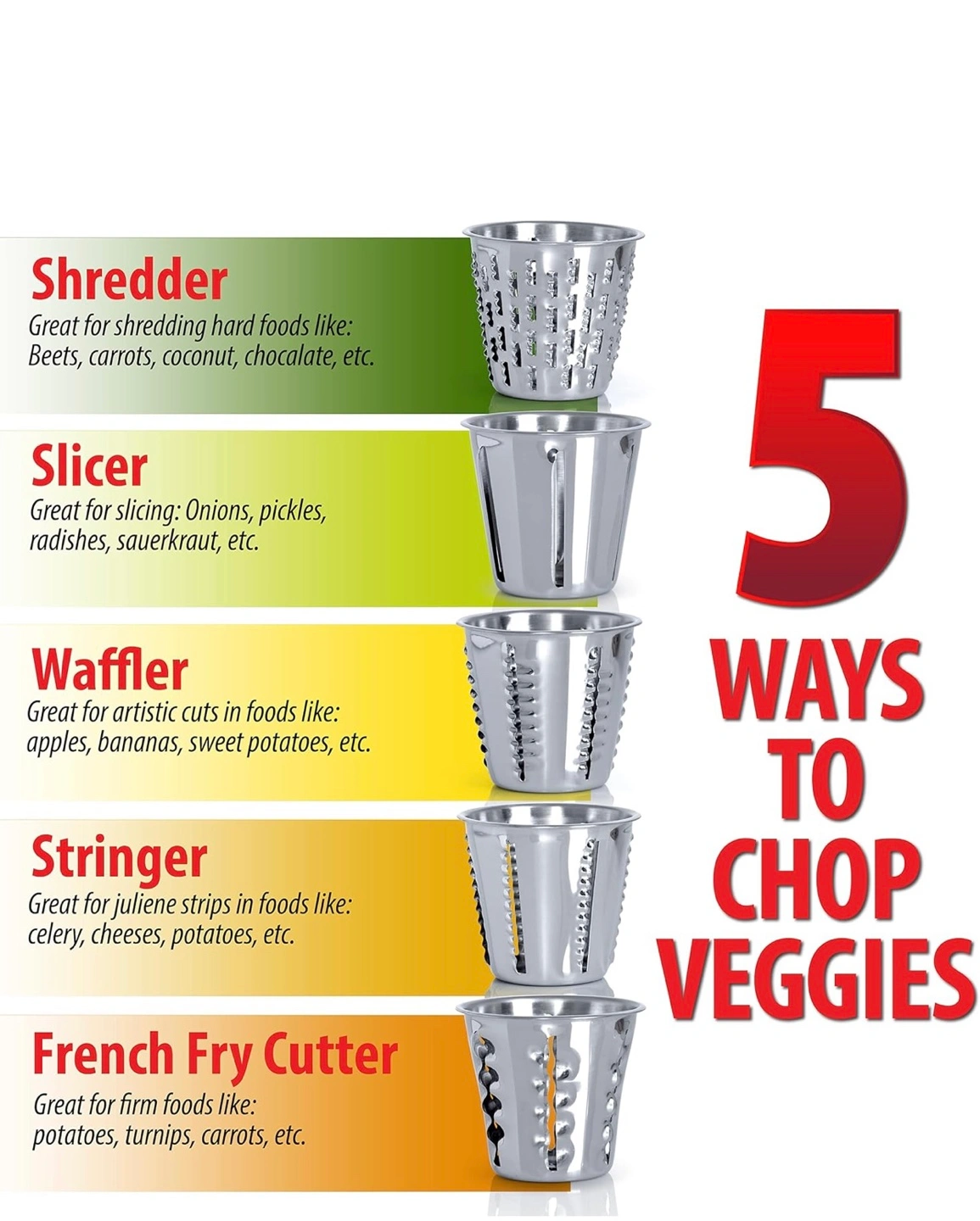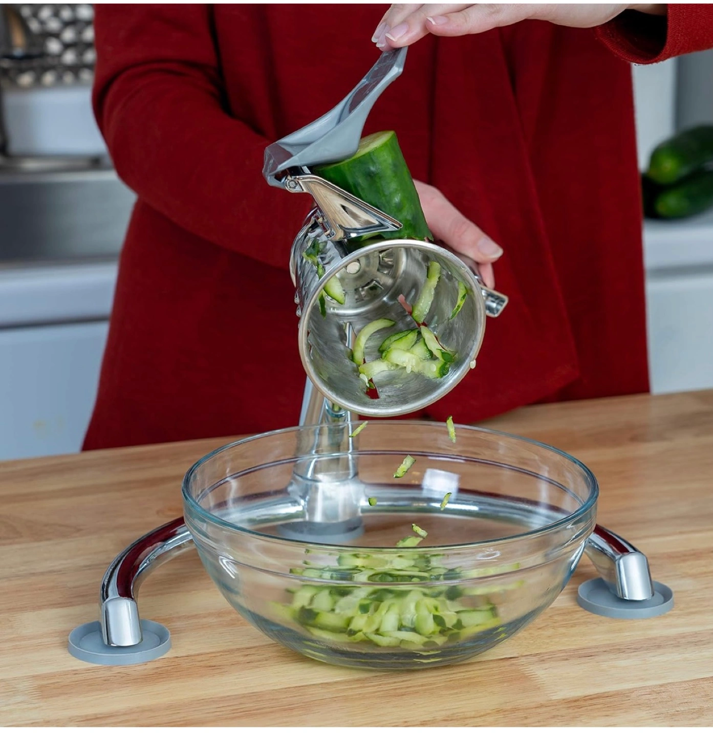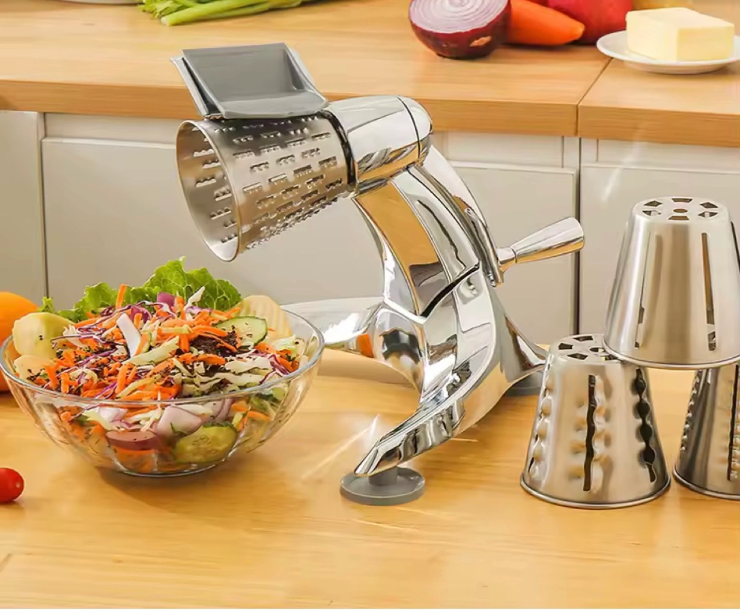 Manual vegetable chopper. Five interchangeable stainless steel drums. Durable construction. Easy to use and clean. Perfect for preparing salads and other dishes.