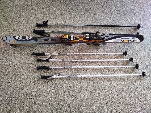 60Get ready to hit the slopes with this set of used Salomon Verse skis, complete with bindings and two pairs of poles! These skis have seen some action but are in good condition and ready for more adventures. The poles include a pair of Gipron and a pair with a Chic Style design, so you can switch it up depending on your mood. * Brand: Salomon * Model: Verse * Includes: Skis, bindings, and two pairs of poles I'm asking $150, which is a fantastic price considering similar sets are listed on Kijiji for around $200-$250. If the ad is up, the skis are available.