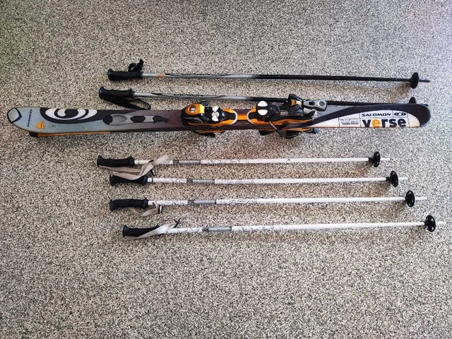 Get ready to hit the slopes with this set of used Salomon Verse skis, complete with bindings and two pairs of poles! These skis have seen some action but are in good condition and ready for more adventures. The poles include a pair of Gipron and a pair with a Chic Style design, so you can switch it up depending on your mood. * Brand: Salomon * Model: Verse * Includes: Skis, bindings, and two pairs of poles I'm asking $150, which is a fantastic price considering similar sets are listed on Kijiji for around $200-$250. If the ad is up, the skis are available.