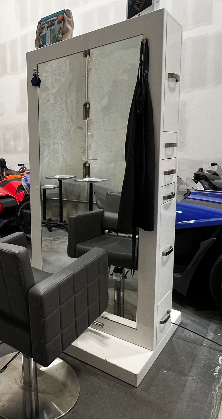 Selling a salon styling station with a mirrors. It features a white cabinet with drawers for storage. Great for a salon or home setup! 4 available. price is for each pod.