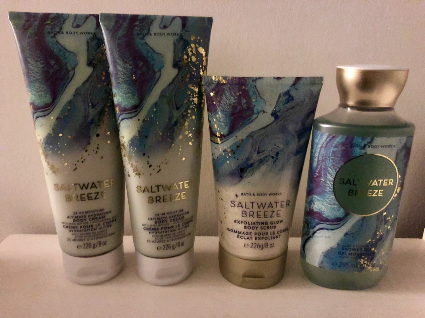 Limited edition scent, full-sized, unused, Saltwater Breeze scented: • Body Creams (x2) • Body Wash • Body Scrub Selling because I overstocked. Won’t be able to use it before it expires— I have too many toiletries to begin.