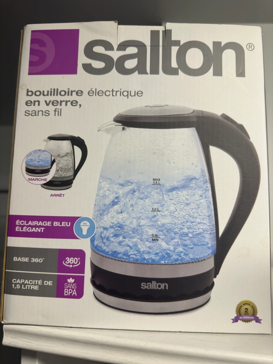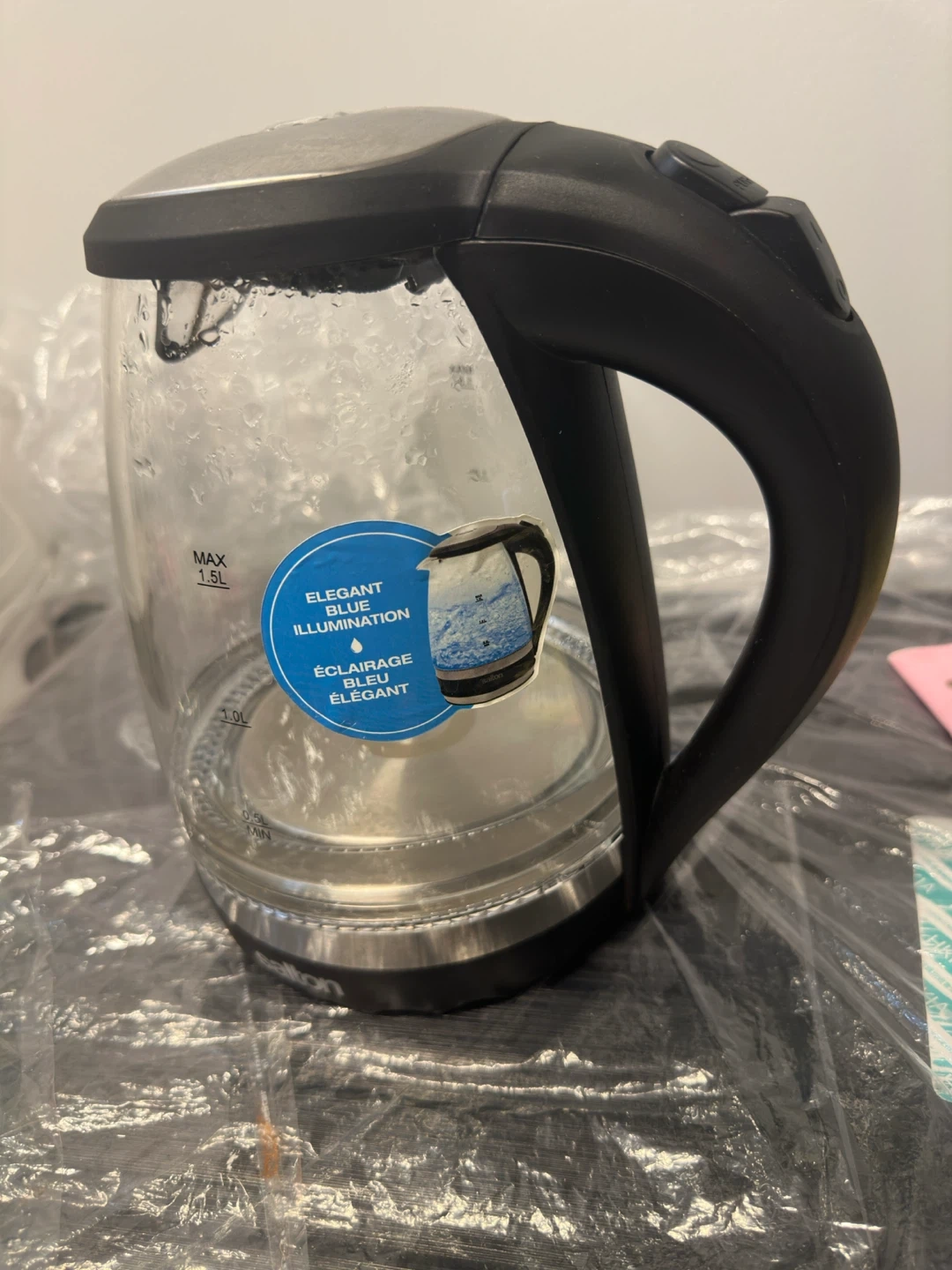 16Selling a brand new Salton electric kettle! It's a glass kettle with a 1.5L capacity. It features a stylish blue illumination and a 360° base. Get boiling water quickly and easily!