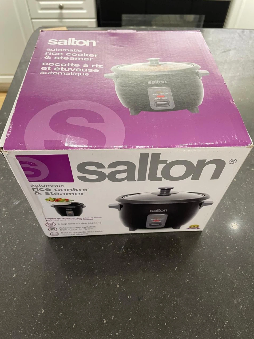 12I'm selling a Salton automatic rice cooker and steamer. It's in great condition and includes all the components. It has a 5-cup cooked rice capacity and automatically switches from 'Cook' to 'Warm'. It can also be used to steam food. The box is included too!