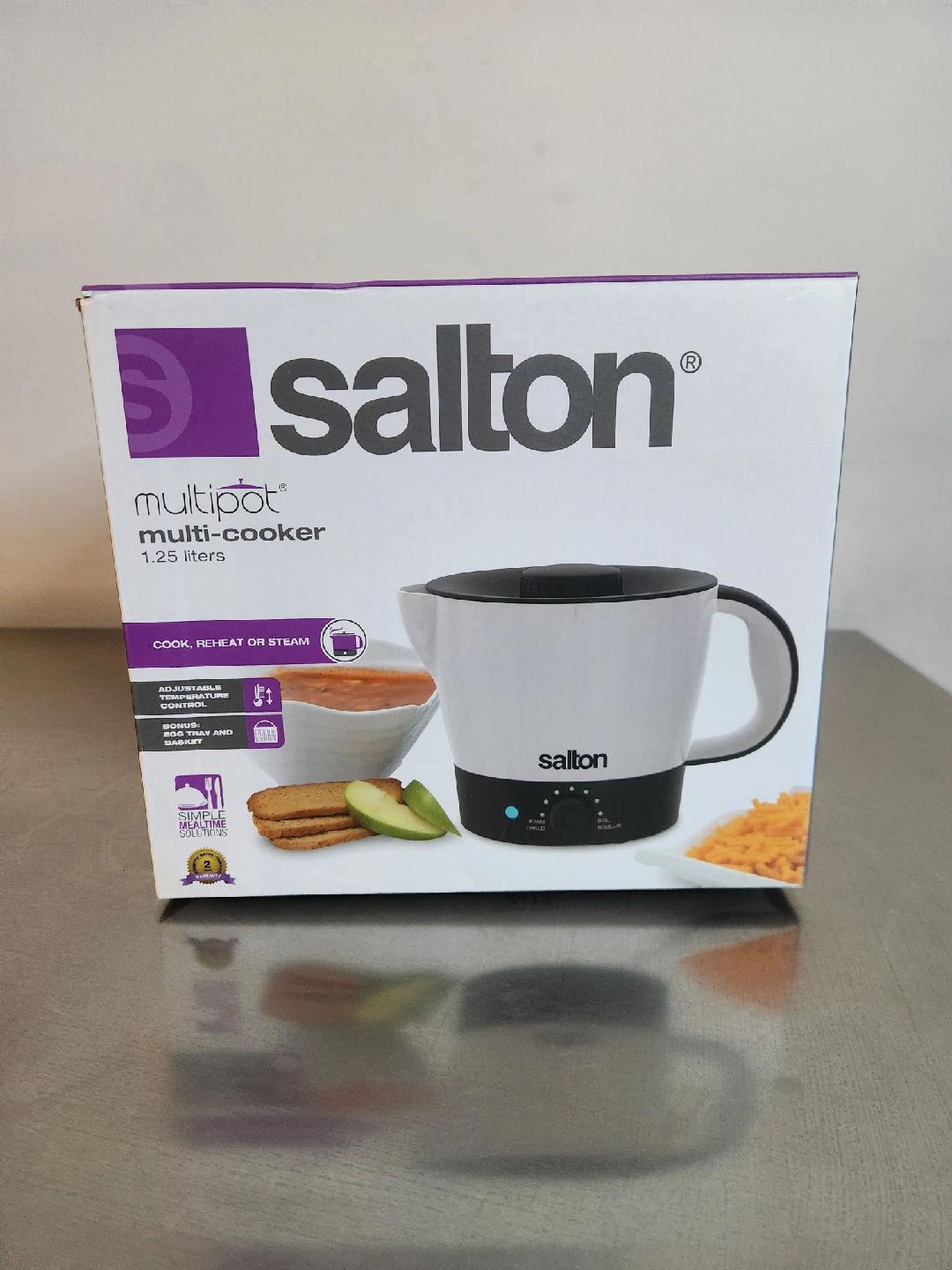 132Brand new in opened box Selling a brand new Salton Multipot multi-cooker with a 1.25-liter capacity! It's perfect for cooking, reheating, or steaming. - Removable lid with built-in strainer - Adjustable temperature control - Includes a convenient noodle and steamer basket - Also comes with an egg tray Boils water, cooks rice, ramen, pasta, mac & cheese, heats soups, canned foods and more!