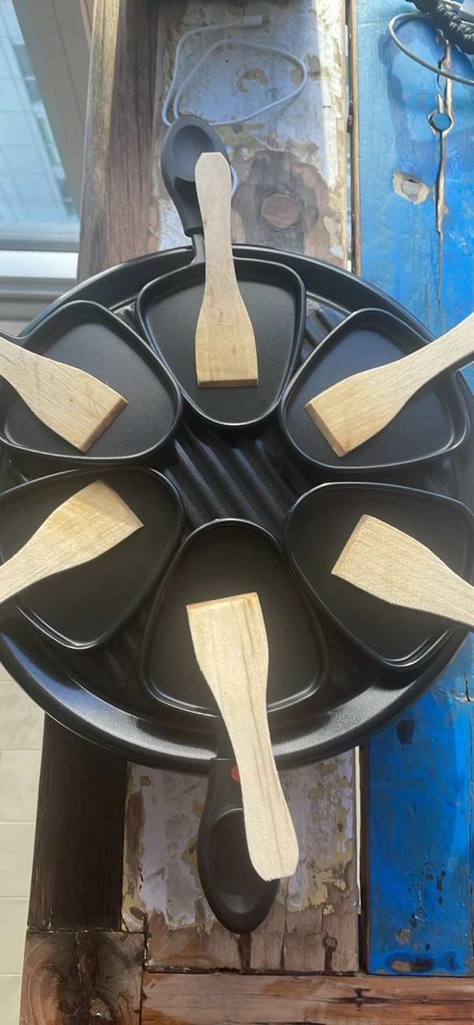 Selling a Salton Raclette Grill. It's perfect for a fun and interactive dinner party! This grill comes with individual pans and spatulas for each person, so everyone can customize their own dish. It's in great condition and ready for a new home