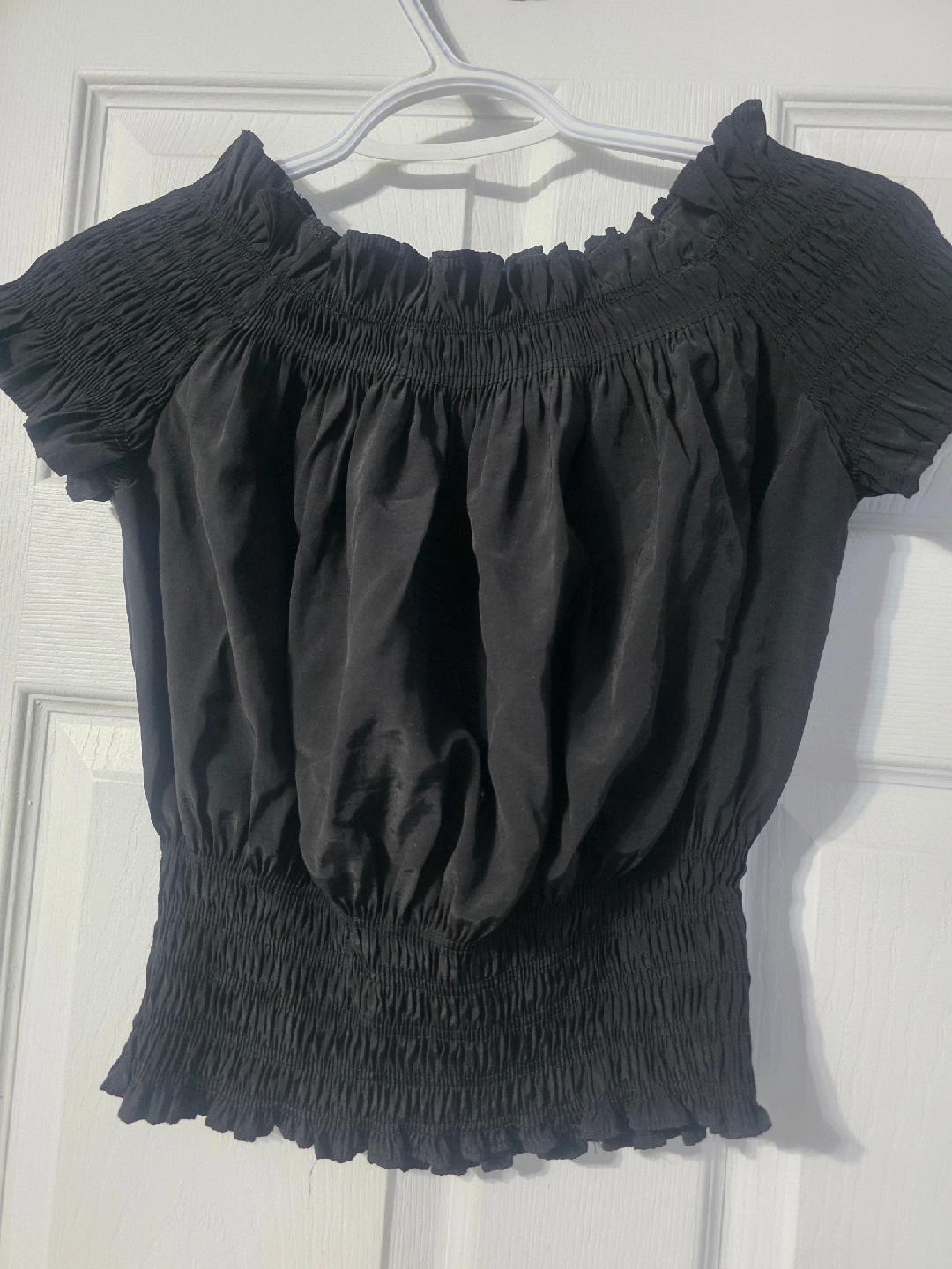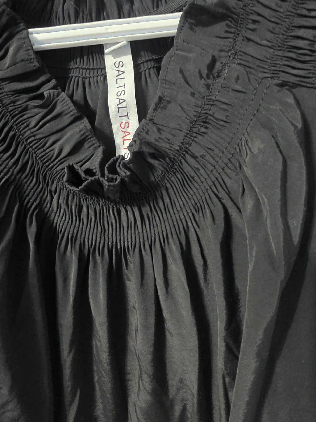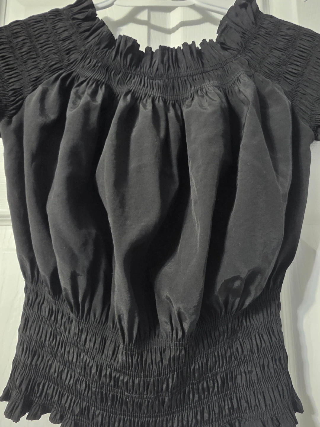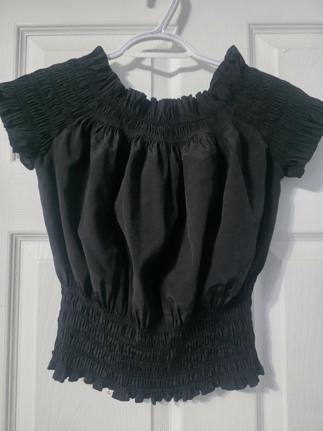 This is a cute black off-shoulder top from SALTS. It features a smocked design on the top and bottom, giving it a stylish and comfortable fit. It's perfect for dressing up or down!