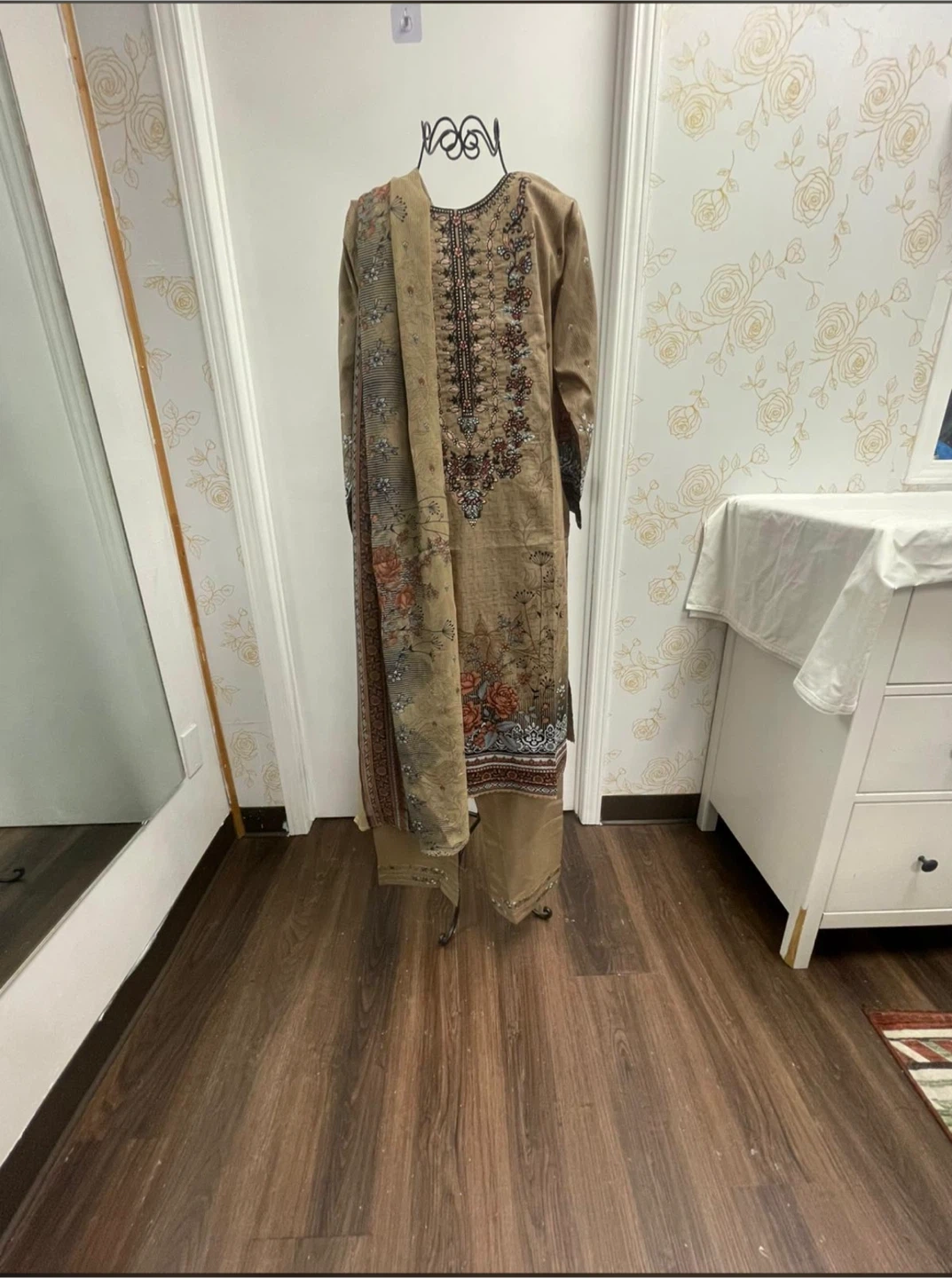 Beautiful beige salwar kameez suit, perfect for any occasion! The intricate design adds a touch of elegance to this traditional outfit. It comes with a matching dupatta to complete the look. In great condition! 3 pieces brand new branded. I have small and medium size left. See my other listing what i have left. My store location is 695 Markham road second floor unit 32.