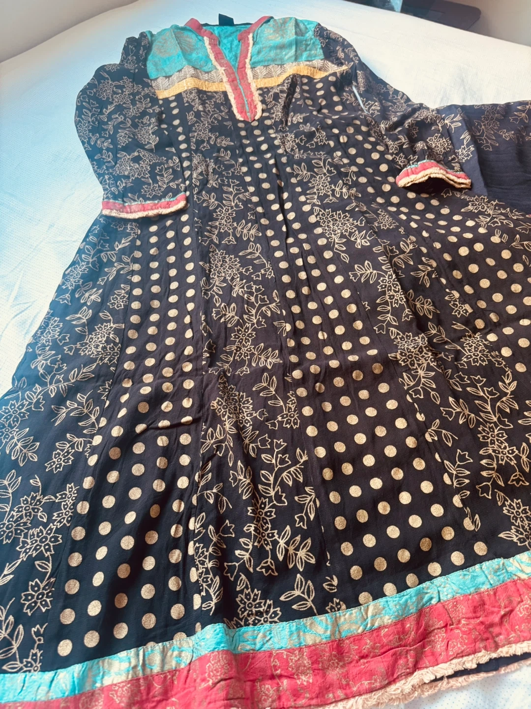 109Selling a salwar kameez suit. It has a black top with gold floral and polka dot patterns, along with some colourful detailing. It comes with a matching full length dupatta and trouser pant. The size is medium/small.