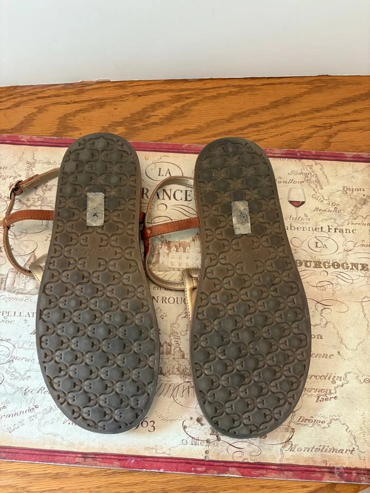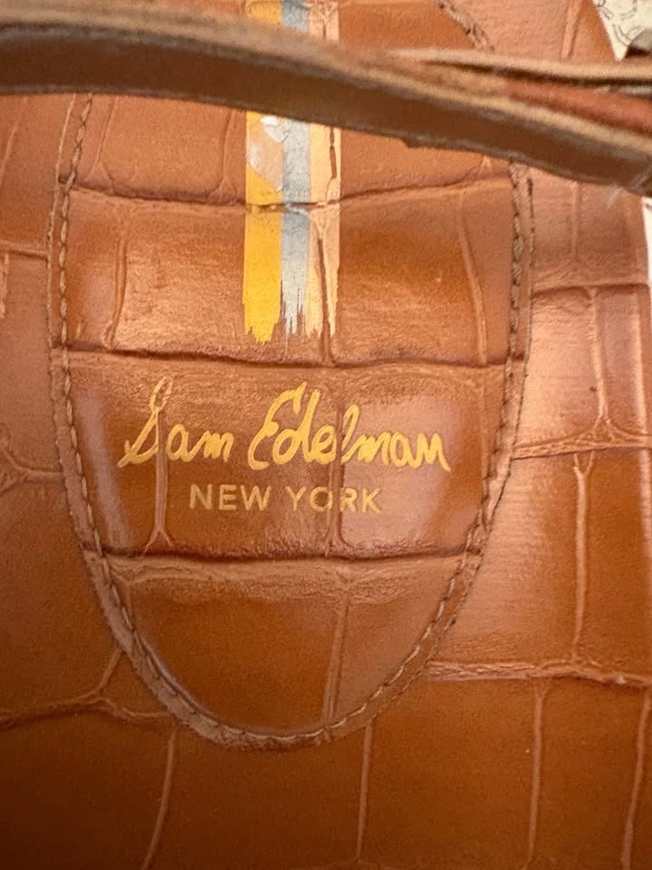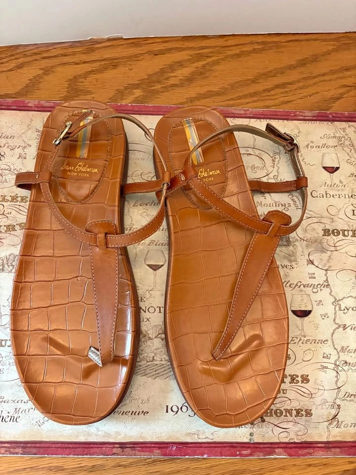 Selling a pair of gently used Sam Edelman Naomi sandals in brown leather with a croc-embossed design. They feature a minimalist T-strap and a flat, padded footbed for all-day comfort. The sandals have an adjustable ankle strap with a buckle closure. Size: 8 Price: $35 CAD Condition: Gently used, as shown in pictures. Details: Brand: Sam Edelman Model: Naomi Color: Saddle/Brown Material: Leather upper with a synthetic sole Closure: Buckle strap