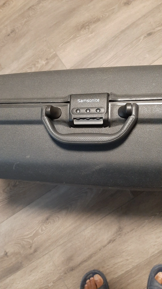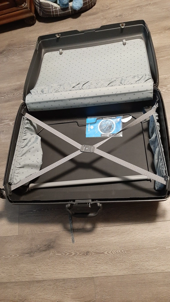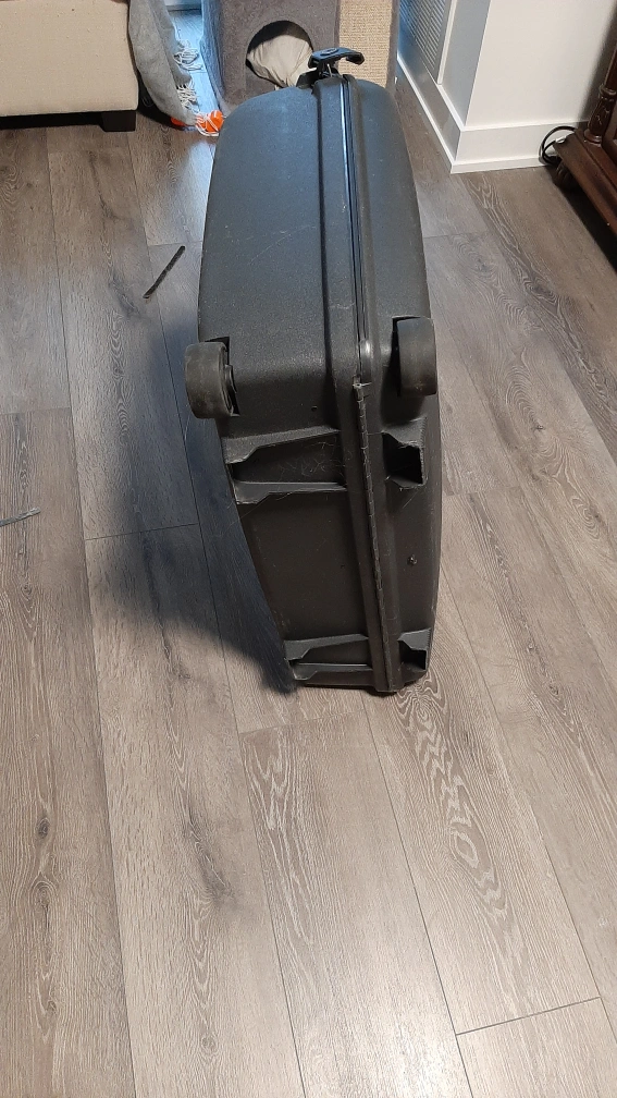 18Large hard-shell suitcase. Features wheels and a retractable handle. Interior includes cross straps for securing items. Pre-owned, shows some wear. Similar new models with same size cost hundreds of dollars. A real bargain.