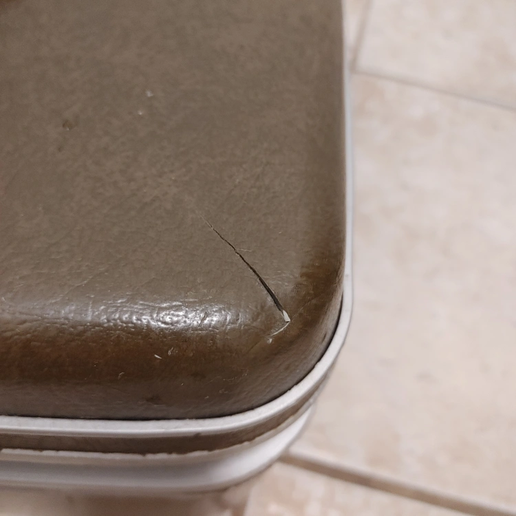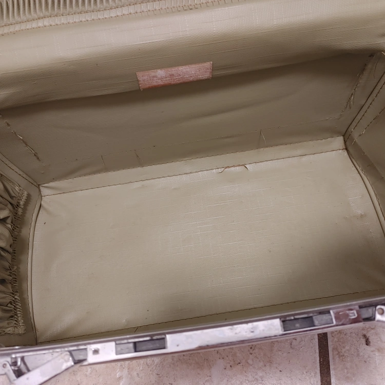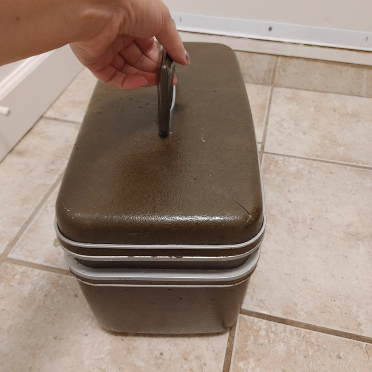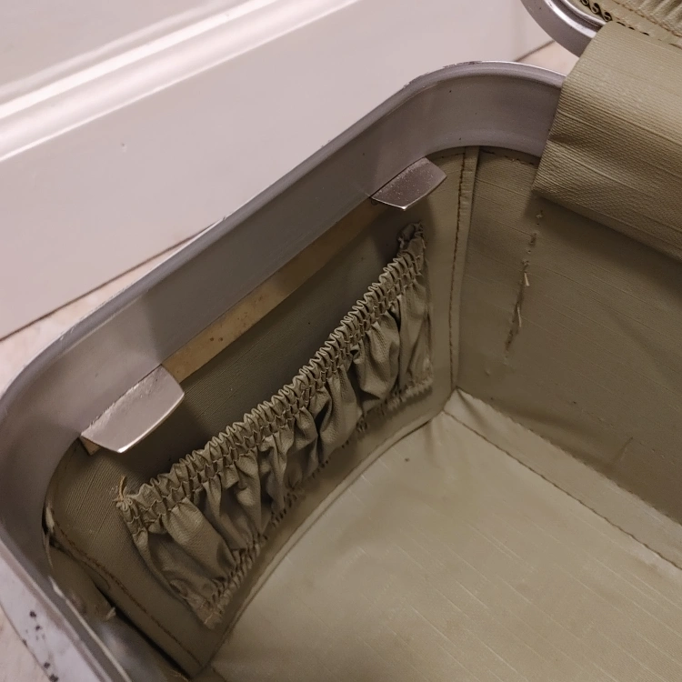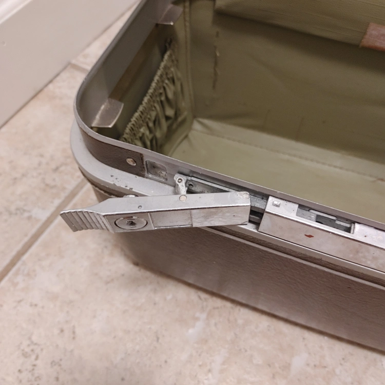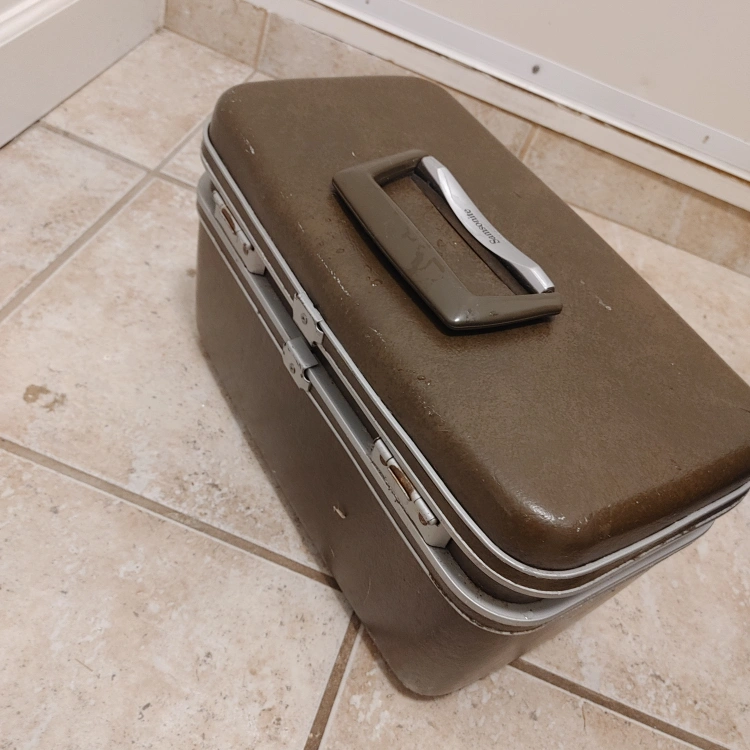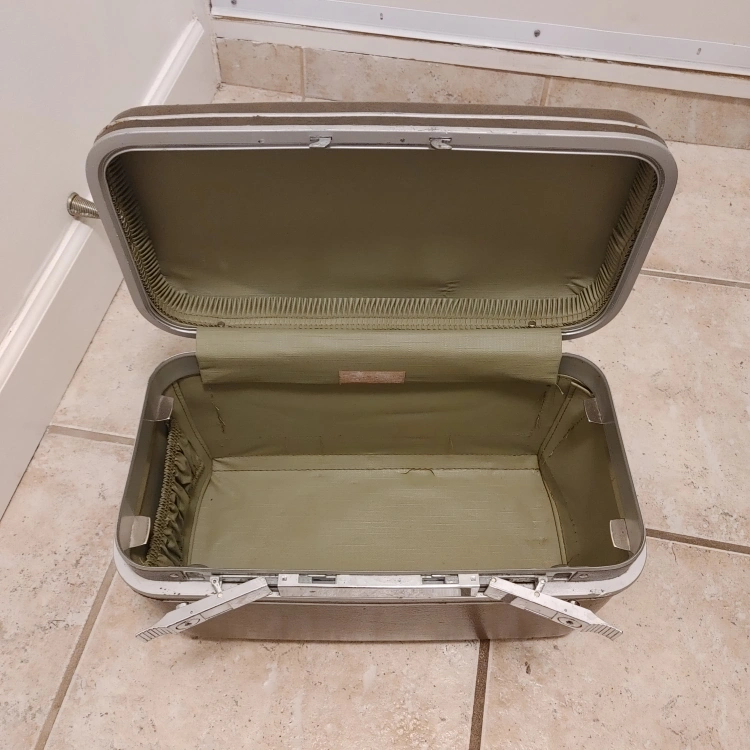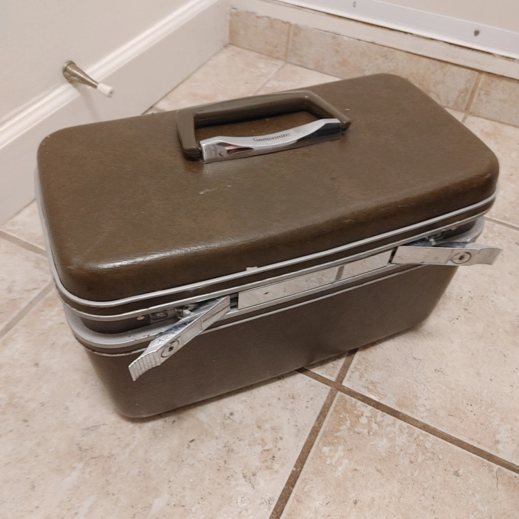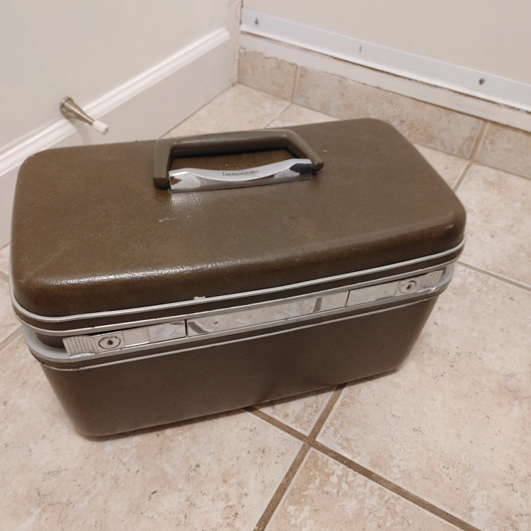 Vintage Samsonite travel case in a brown/olive colour. perfect for storing small items Has a handle for easy carrying and a latch to keep it closed. keys missing