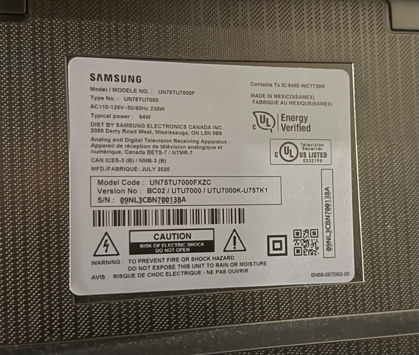 116SAMSUNG 75’ SmartTV 4K (2020) Model: UN75TU7000F July 2020 Good condition, working perfect. Location pick up Islington and Bloor