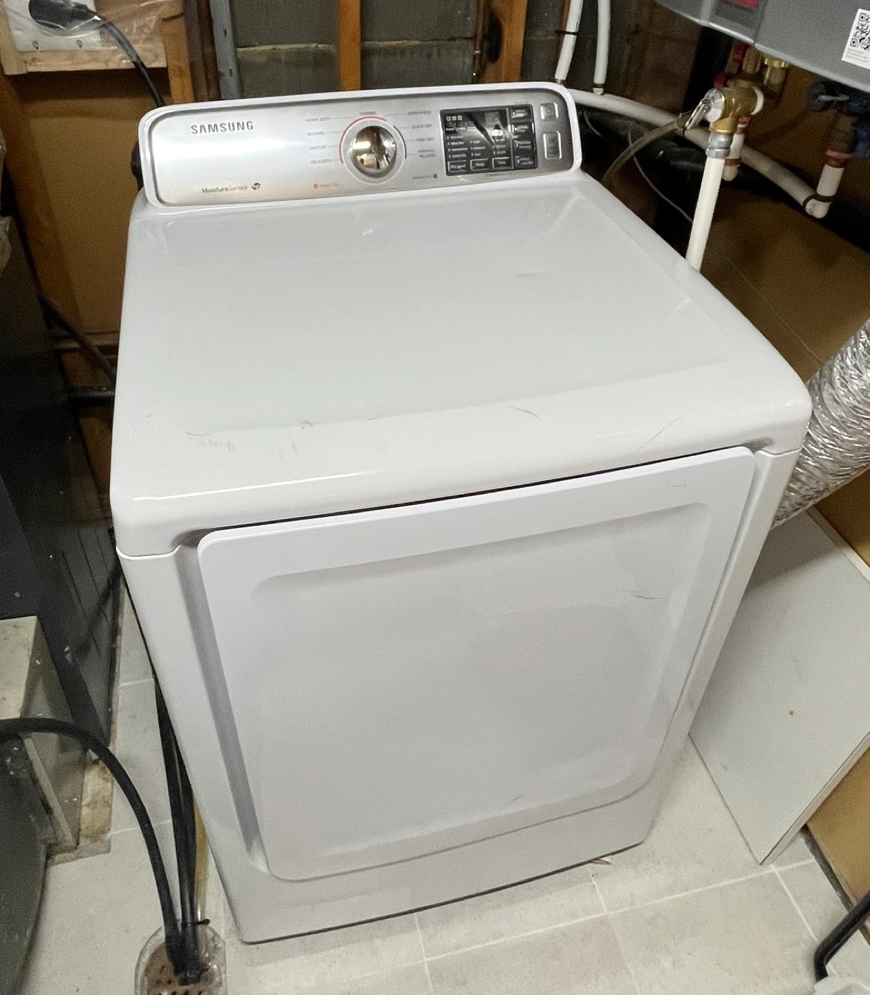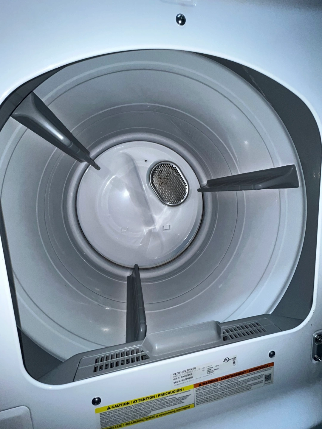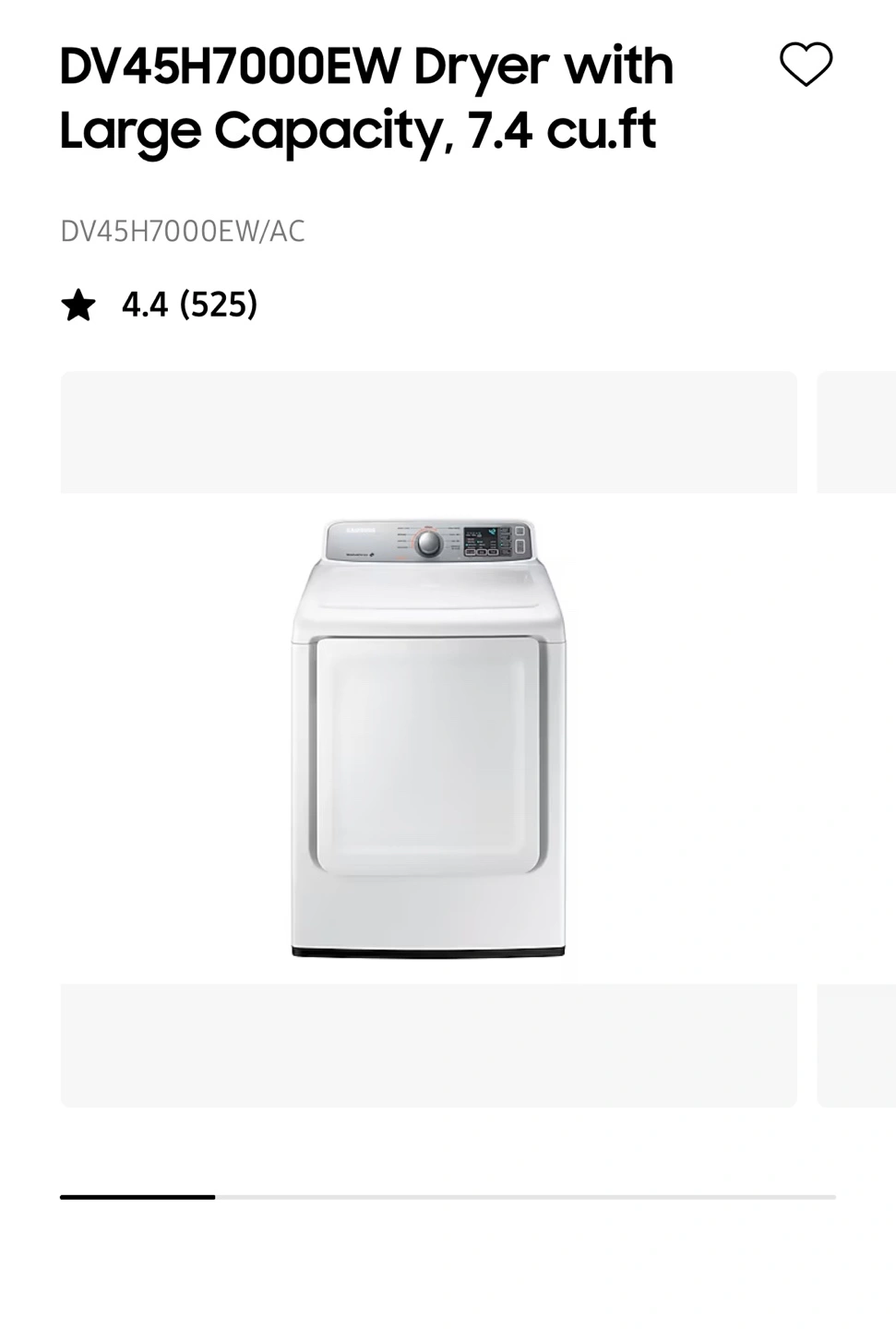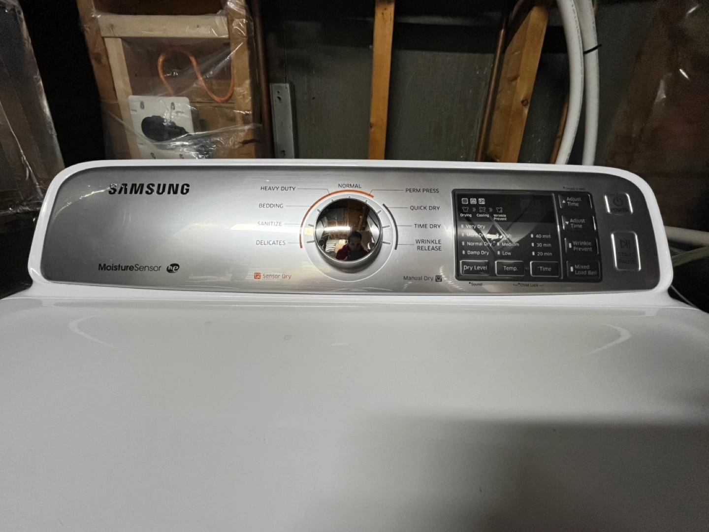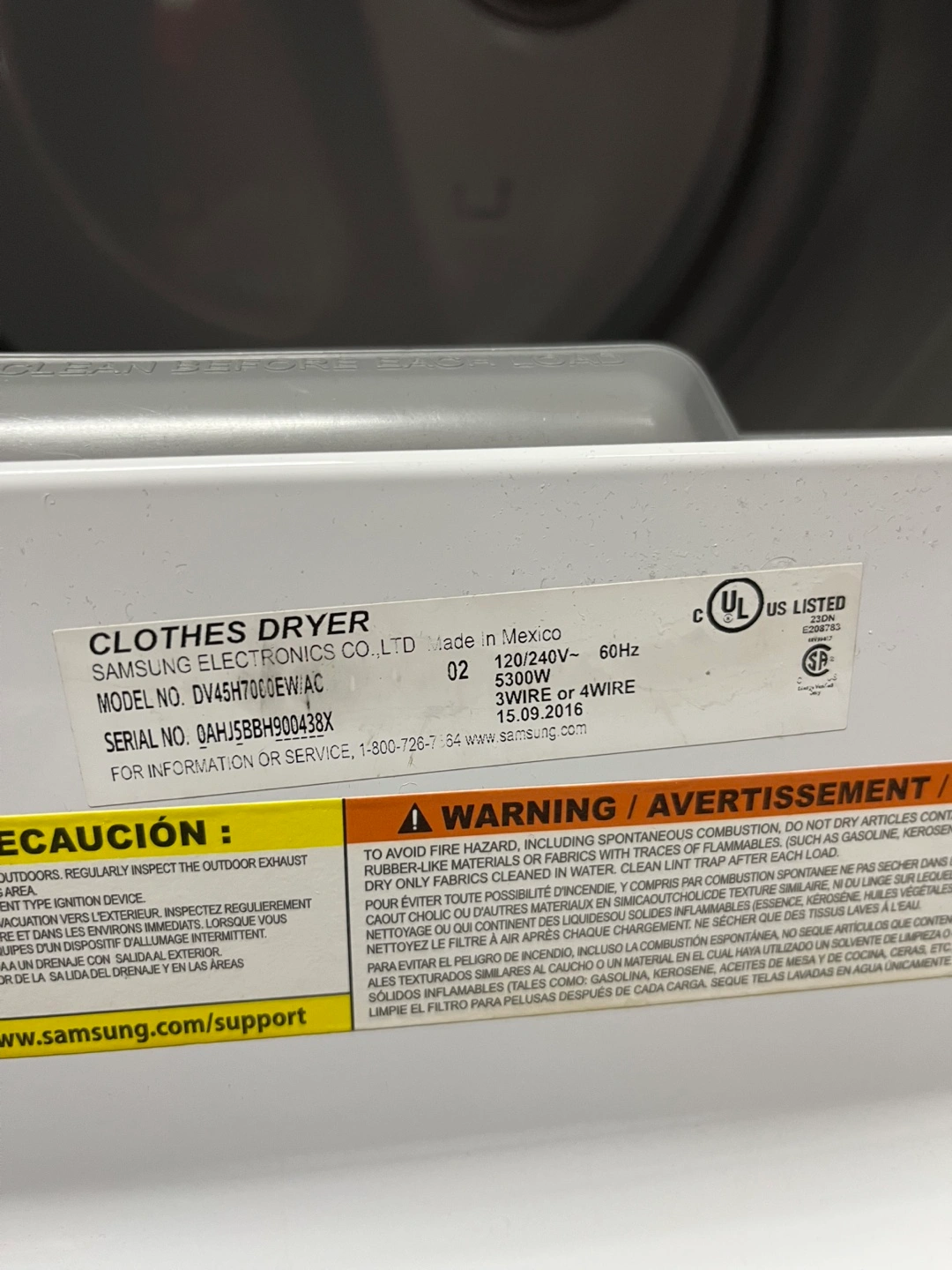 108Samsung 7.4 Cu. Ft. Electric Dryer (DV45H7000EW/AC) Simplify laundry day with the Samsung 7.4 Cu. Ft. Electric Dryer. Its large capacity drum handles big loads, while Sensor Dry technology ensures even drying without damage. With 9 preset cycles and a wrinkle prevention feature, this dryer offers efficient, hassle-free performance in a sleek, reliable design. Selling this unit because we recently renovated our Laundry Room and require a bigger unit that can cater to growing family needs. The unit is functional, with two minor deficiencies including a worn out dryer drum seal and a short part of the door gasket that sags a bit. These minor issues do not affect normal drying operation and the door shuts tight. We have had no issues operating the dryer for the two years we have used it. Dimensions (WxHxD) 686 x 1114 x 761 mm