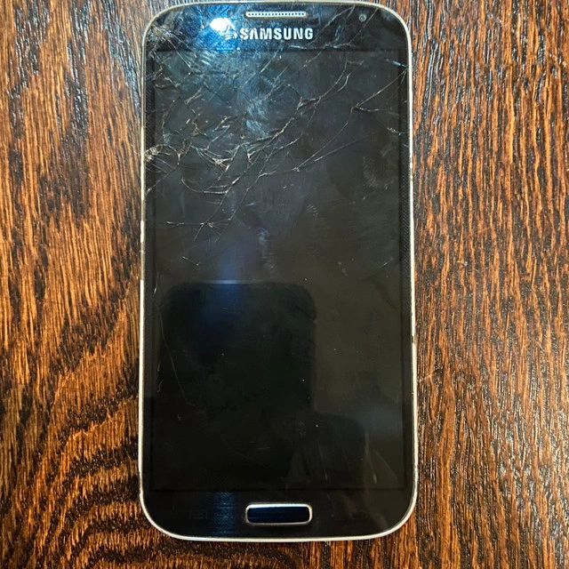 Selling a used Samsung Galaxy S4 smartphone. Please note, it has a cracked screen, as shown in the pictures, and is being sold for parts or repair only. It's perfect for someone who needs spare parts or wants to practice repairs. It may bring you back to the good old days of 2013. If the ad's still up, it's still up for grabs!