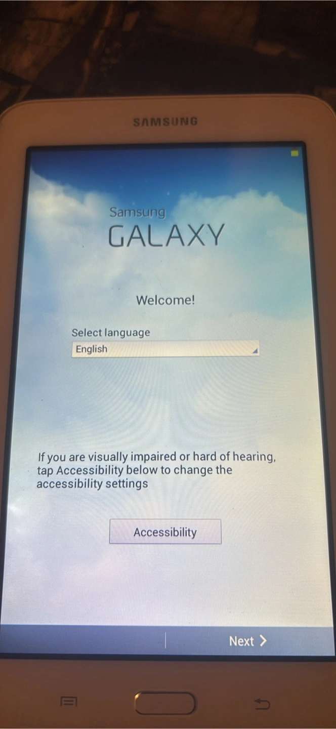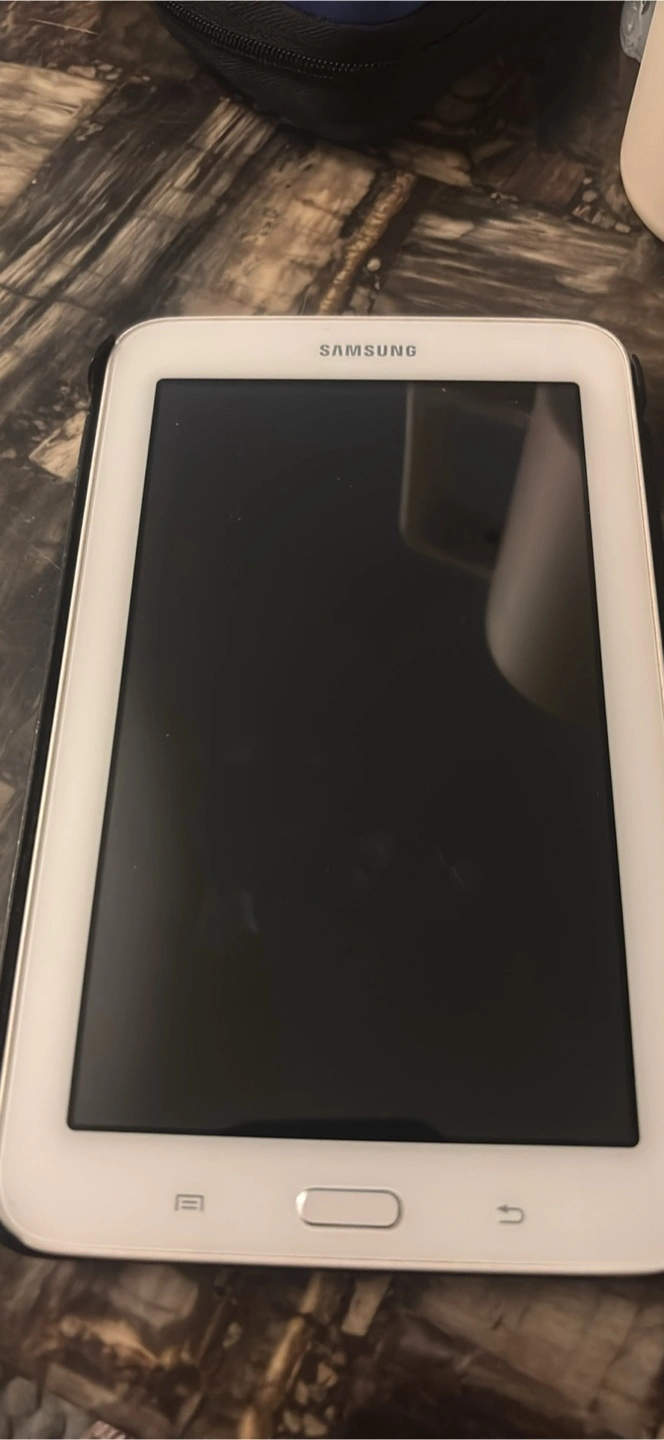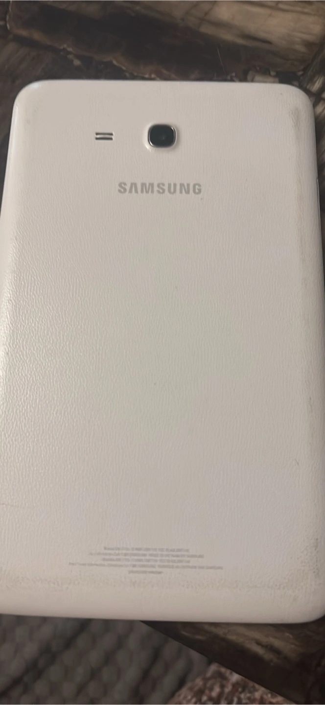 Samsung Galaxy Tab 3 Lite, 7-inch tablet in white. It's in used condition, but still works great for basic tasks like browsing and watching videos. Perfect for someone looking for a simple and affordable tablet! Comes with 16 GB sd card