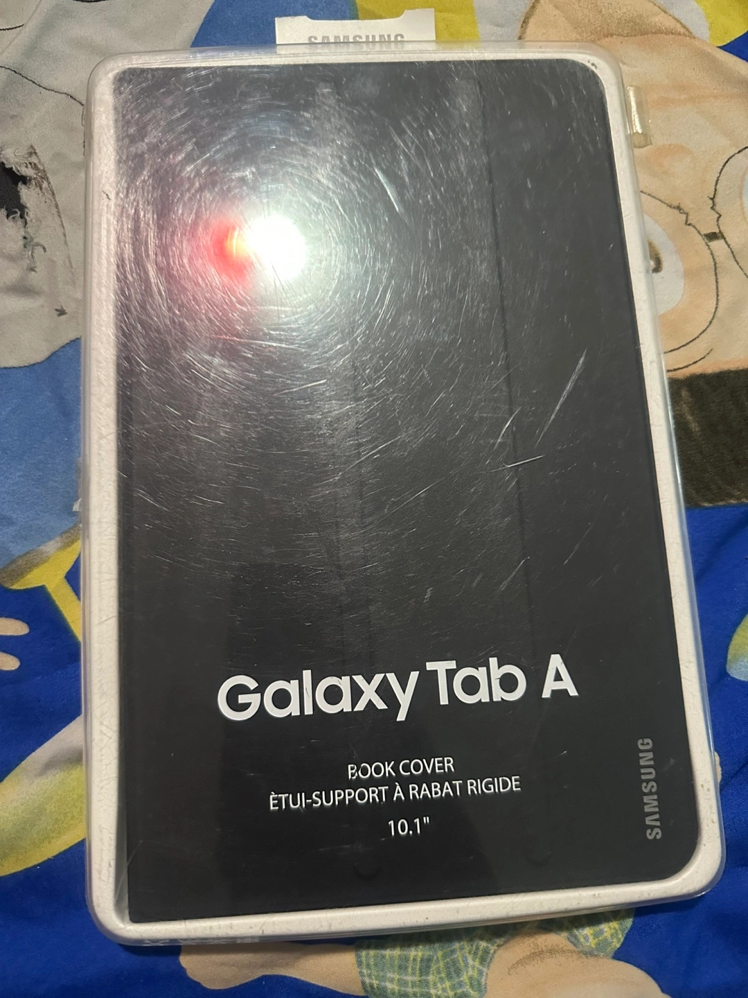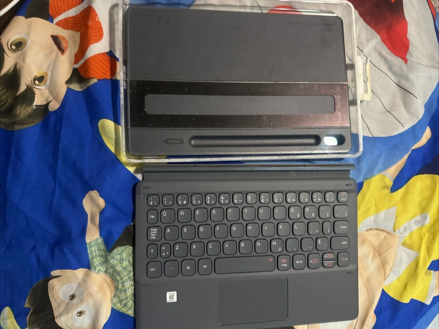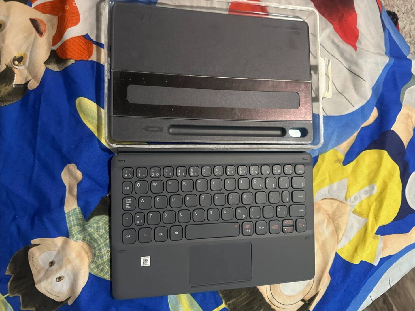 86A tablet cover, it has a keyboard and a touchpad. The keyboard has various keys and a space for the stylus. Imagine using it in a cozy cafe while enjoying a warm beverage.