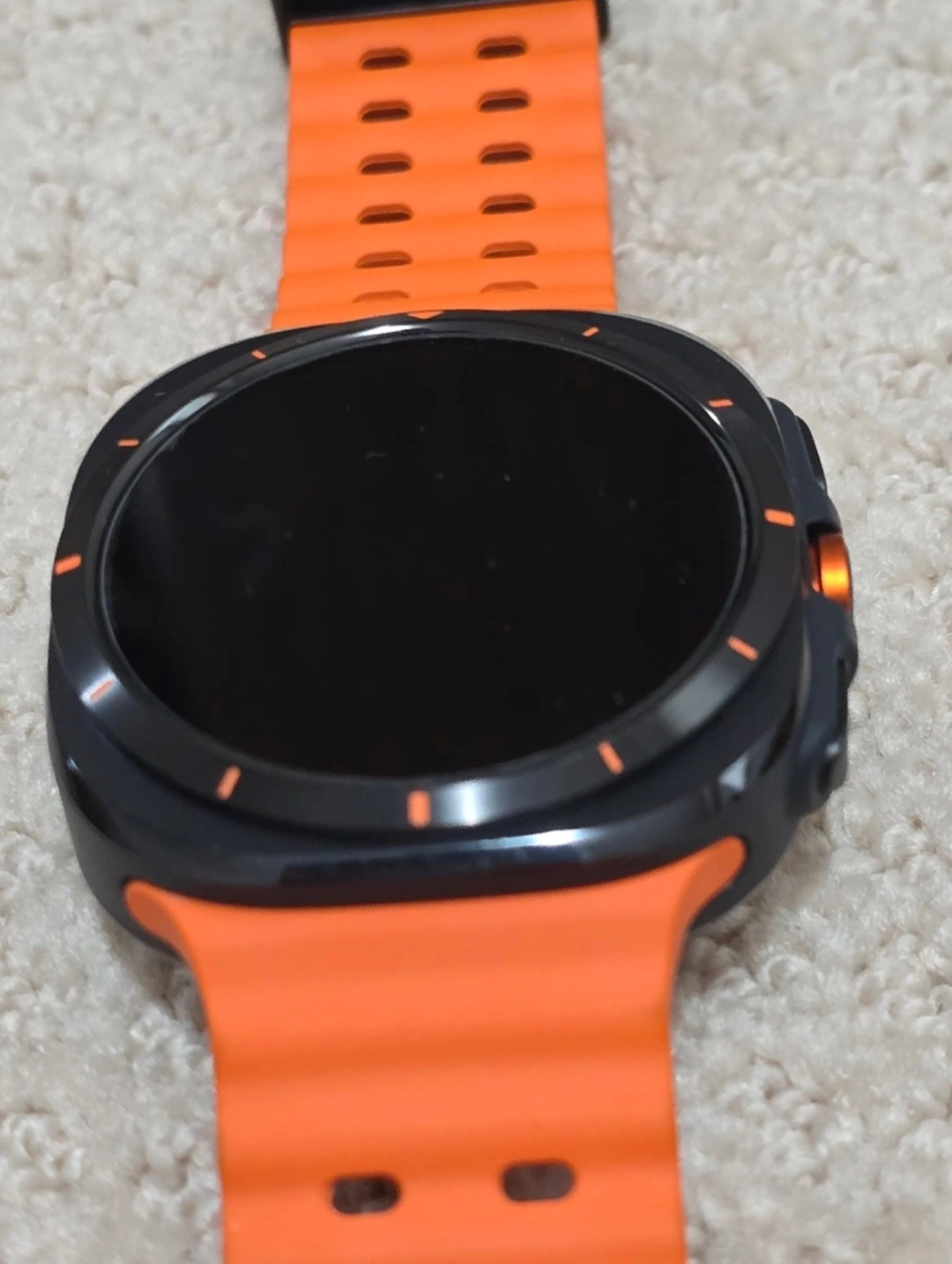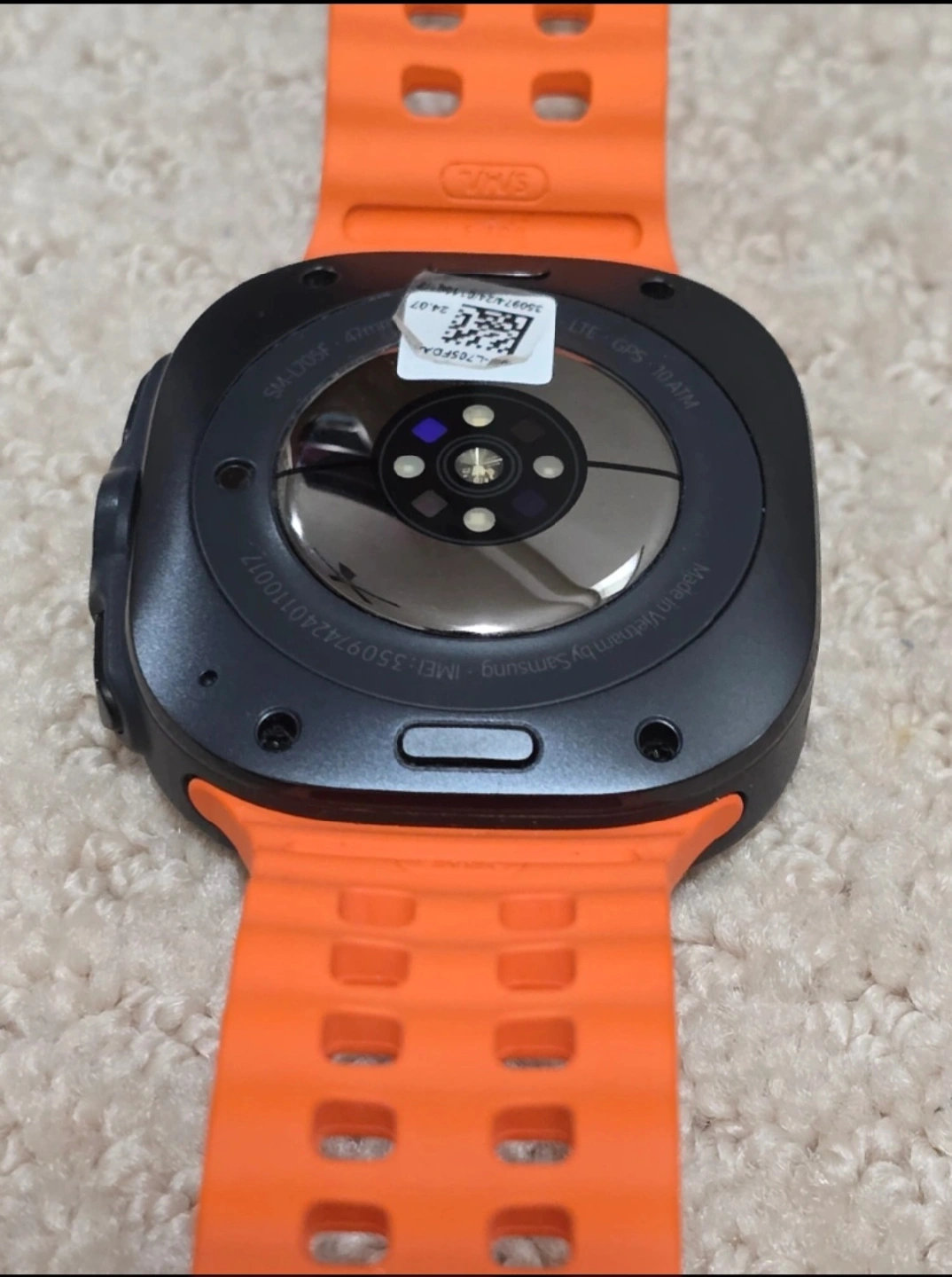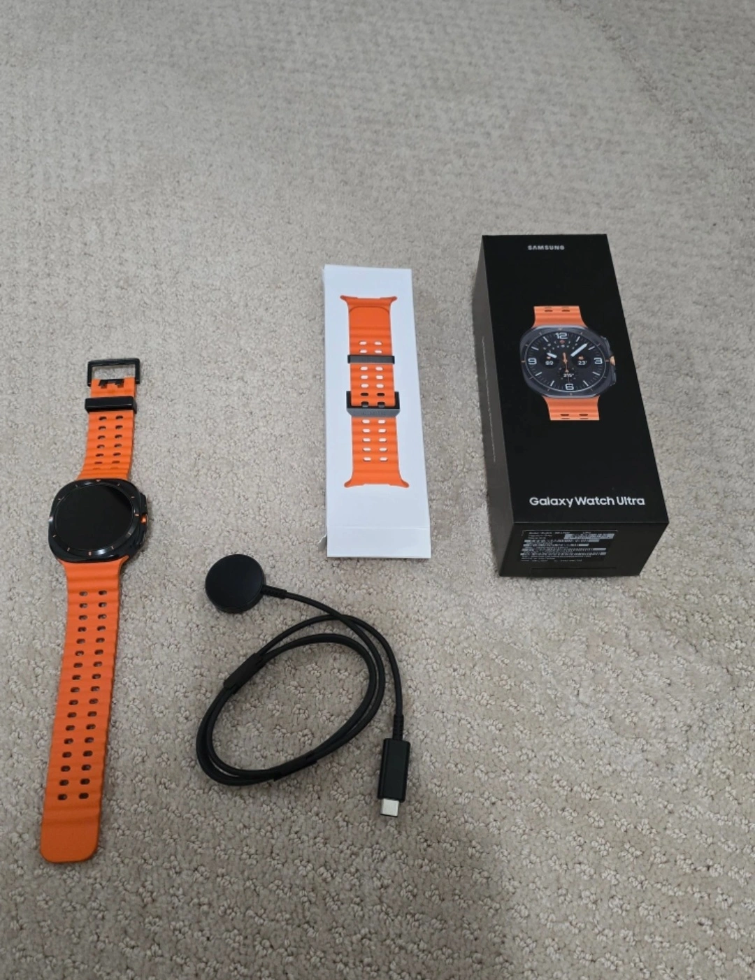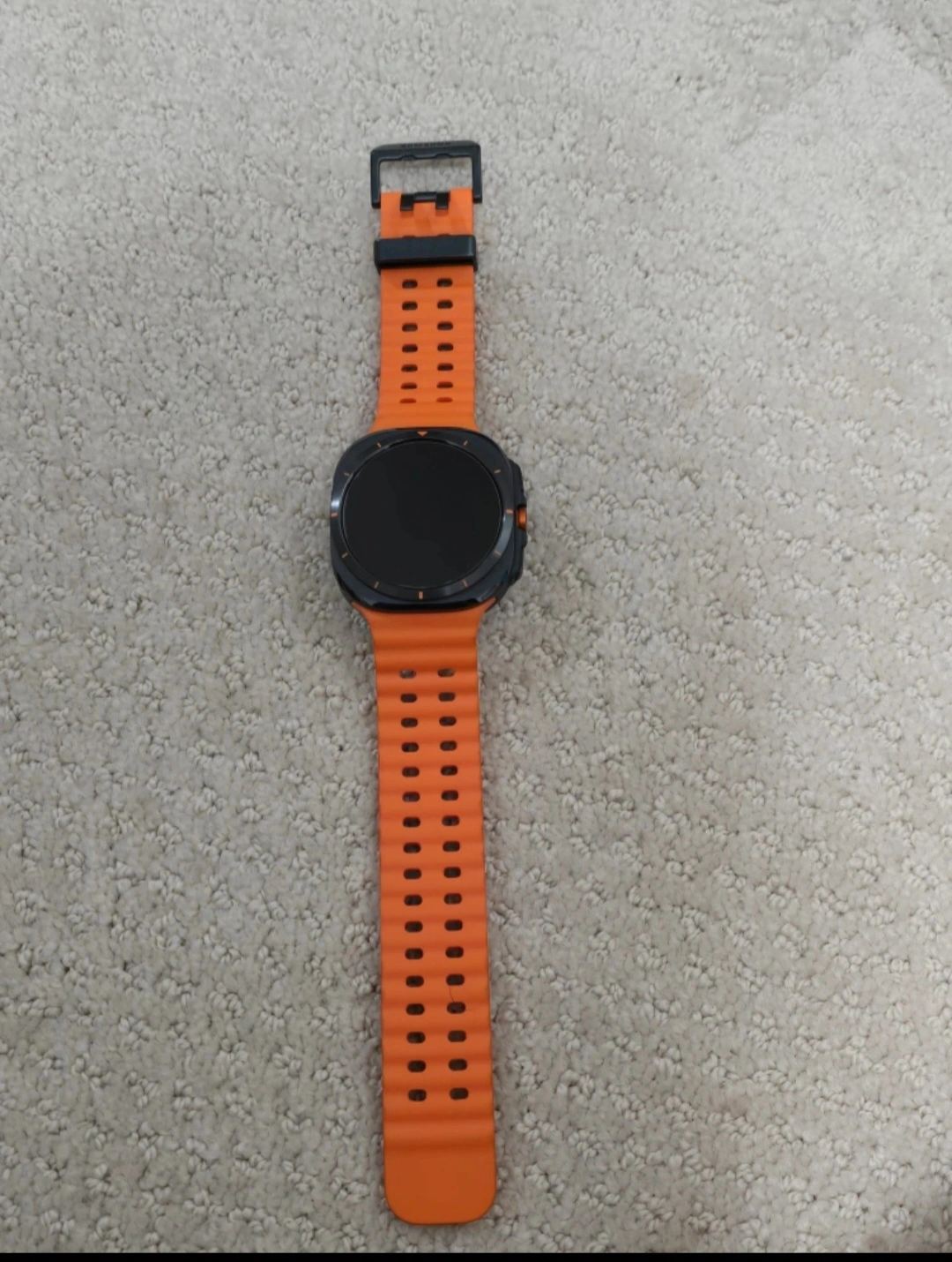 Selling a Samsung Galaxy Watch Ultra with a vibrant orange band! It comes with the original box, charger. This watch is in great condition and ready for a new owner. Feel free to reach out if you're interested LTE version 47mm with screen protector on face