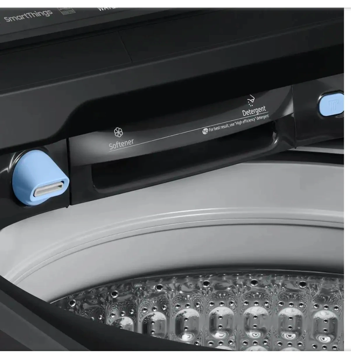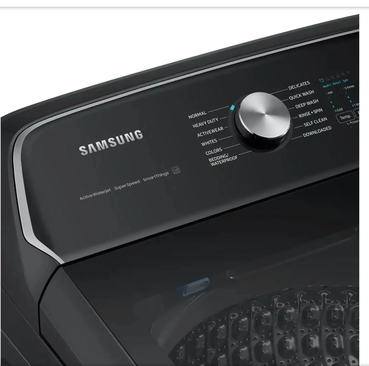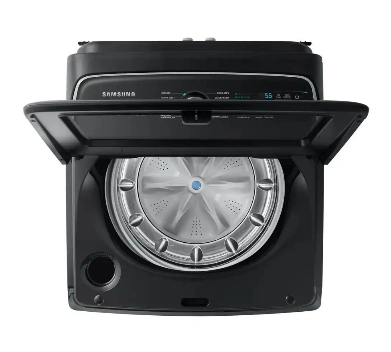 64Samsung's 5.5 cu. ft. Extra-Large Capacity Top Load Washing Machine is equipped with Super Speed Wash, which powerfully cleans a full load of laundry in just 28 minutes. Without sacrificing cleaning performance. With Wi-Fi connectivity, you can remotely start, stop, or delay your smart washer from our simple-touse SmartThings App. Active WaterJet, a built-in water faucet, lets you easily pretreat heavily soiled and stained clothes. Fewer loads, less time in the laundry room, and more time doing the things you love. With Wi-Fi connectivity, remotely start, stop, or delay your washer from one simple-to-use app. Get cycle recommendations based on soil level, energy usage notifications and so much more Wash a full load of laundry in just 28 minutes* without sacrificing cleaning performance. A built-in water faucet lets you easily pretreat soiled or heavily stained clothes with the press of a button. Scrub items right inside your washer, no laundry room sink needed. Samsung washing machines are assembled in America, and are covered by a 20-Year Warranty on the Digital Inverter Motor.* Purchase with confidence, and enjoy superior efficiency and long-lasting performance. Selecting the Deep Fill option before starting your laundry maximizes the water level to make sure all your clothes get a thorough soak Do your laundry in peace. Our innovative Vibration Reduction Technology+ reduces noise and vibration and creates a quiet washing experience. Keep your washer tub fresh and clean. Self Clean will notify you every 20 wash cycles when it is time for a cleaning. The thoughtfully designed Soft-Close Lid closes safely, gently, and quietly. The improved tub pattern draws out more water during the rinse cycle and helps prevent clothes from snagging during the wash ENERGY STAR Certified so you use less energy without sacrificing performance or functionality Easy troubleshooting from the convenience of your smartphone.* Smart Care interacts with your washer and dryer to perform an immediate diagnosis and offer quick solutions. Aiding the visually and hearing impaired, your washer and dryer now feature audio assistance, playing a different sound for each option, and braille right next to key control panel buttons.