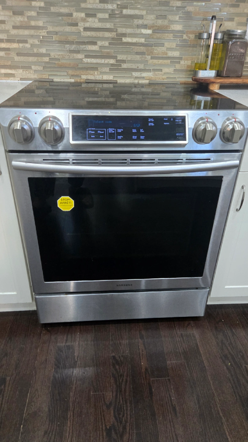 Samsung NE58F9500SS 30" Slide-In Electric Range – Dual Convection Selling my stainless steel Samsung slide-in electric stove, 5.8 cu ft oven with dual convection, 5-burner ceramic glass cooktop (includes warming zone + dual-ring burners), self-clean + 20-min steam clean, storage drawer, and built-in temperature probe. Works perfectly, in great condition. Pick up only Milton