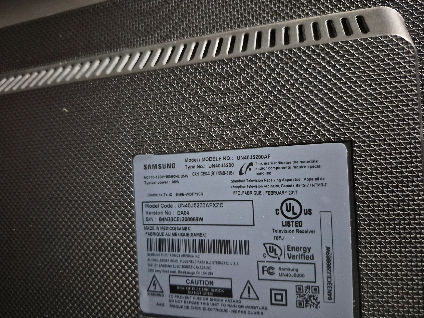 Selling a Samsung 40-inch television. The model number is UN40J5200AF. It was manufactured in February 2017.