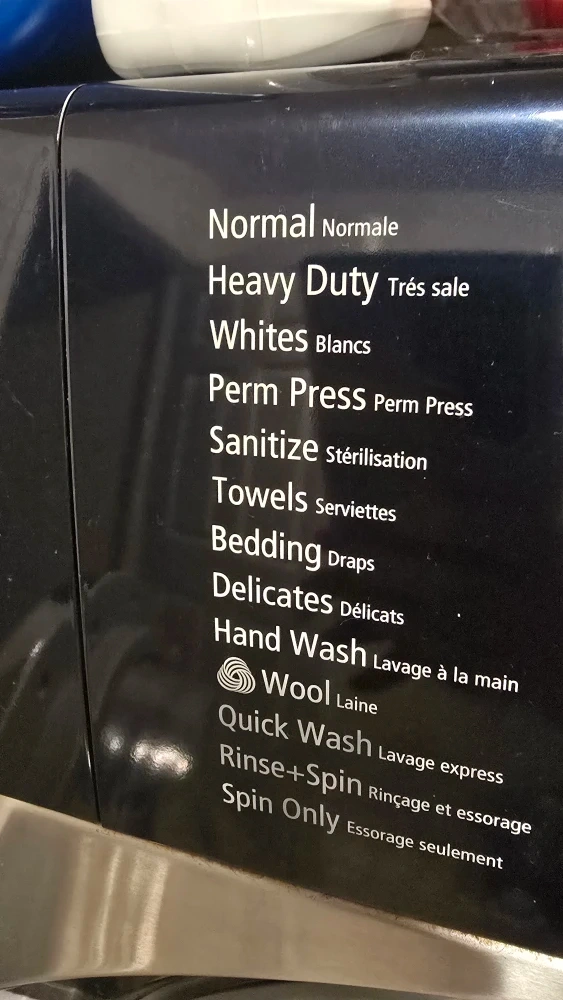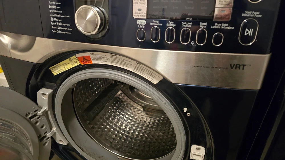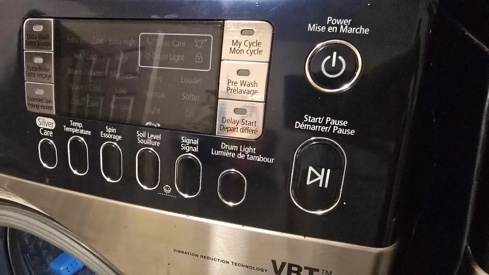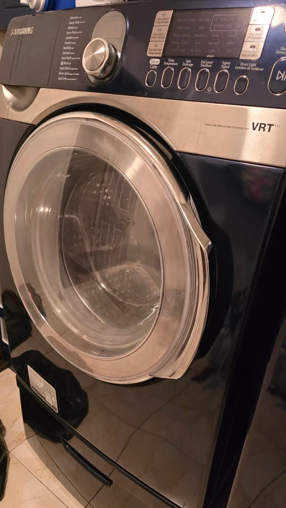 10Samsung washing machine with Vibration Reduction Technology (VRT). It has multiple wash cycles including Normal, Heavy Duty, Whites, Perm Press, Sanitize, Towels, Bedding, Delicates, Hand Wash, Wool, Quick Wash, Rinse+Spin, and Spin Only, Drain pump doesn't work needs to be replaced.
