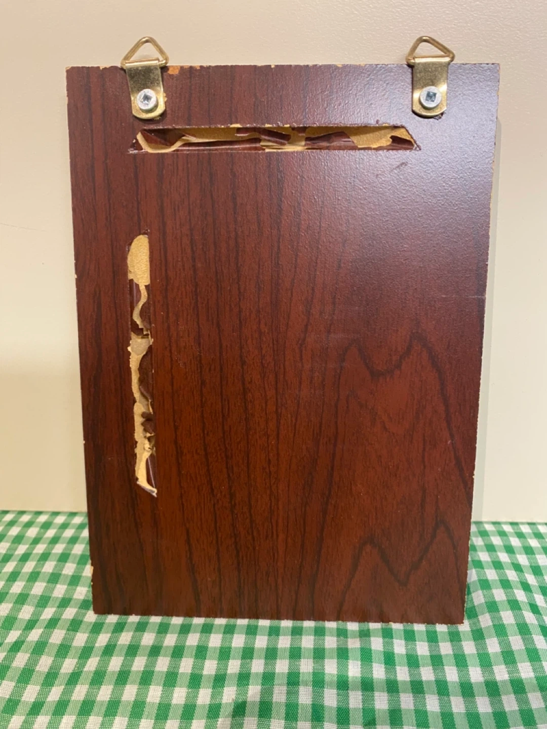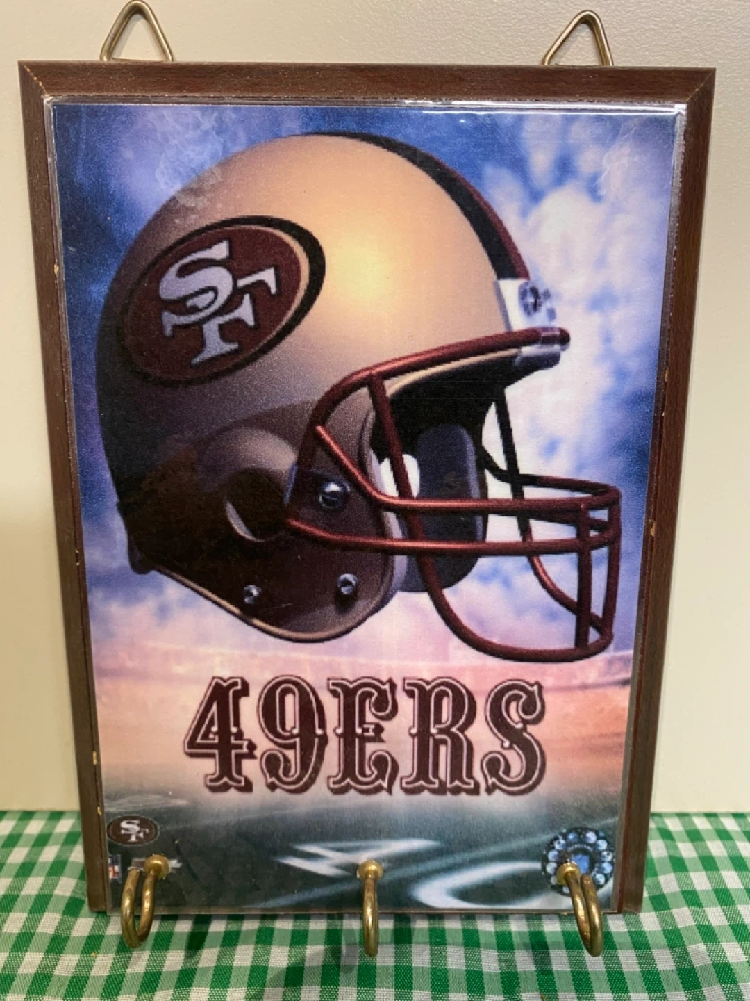 Key holder featuring a San Francisco 49ers helmet design. It has a wood-like frame and three hooks at the bottom for holding keys. Great for any 49ers fan! Approximately 5” wide X 7” tall. Pick up only, Kipling and Highway 7 area of Woodbridge.