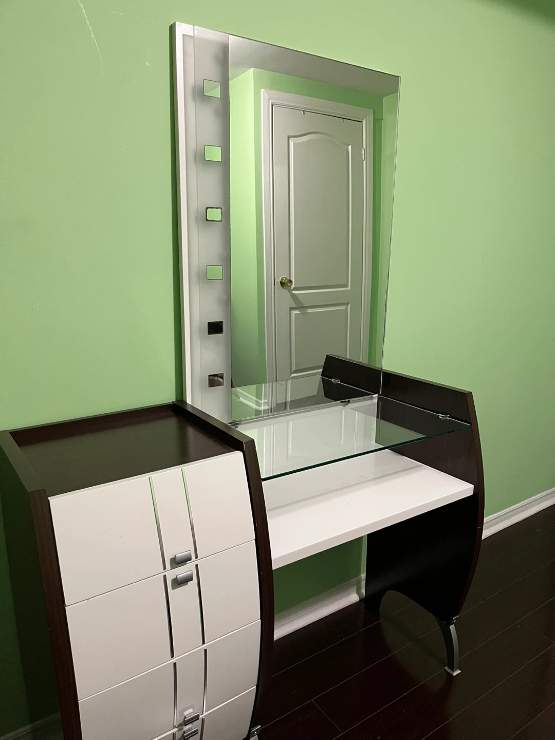This vanity set features a sleek design with a mirror and a matching chest of drawers. The chest has multiple drawers for storage, and the vanity offers a clear surface with an integrated shelf and glass top. It's a stylish addition to any bedroom or dressing area.