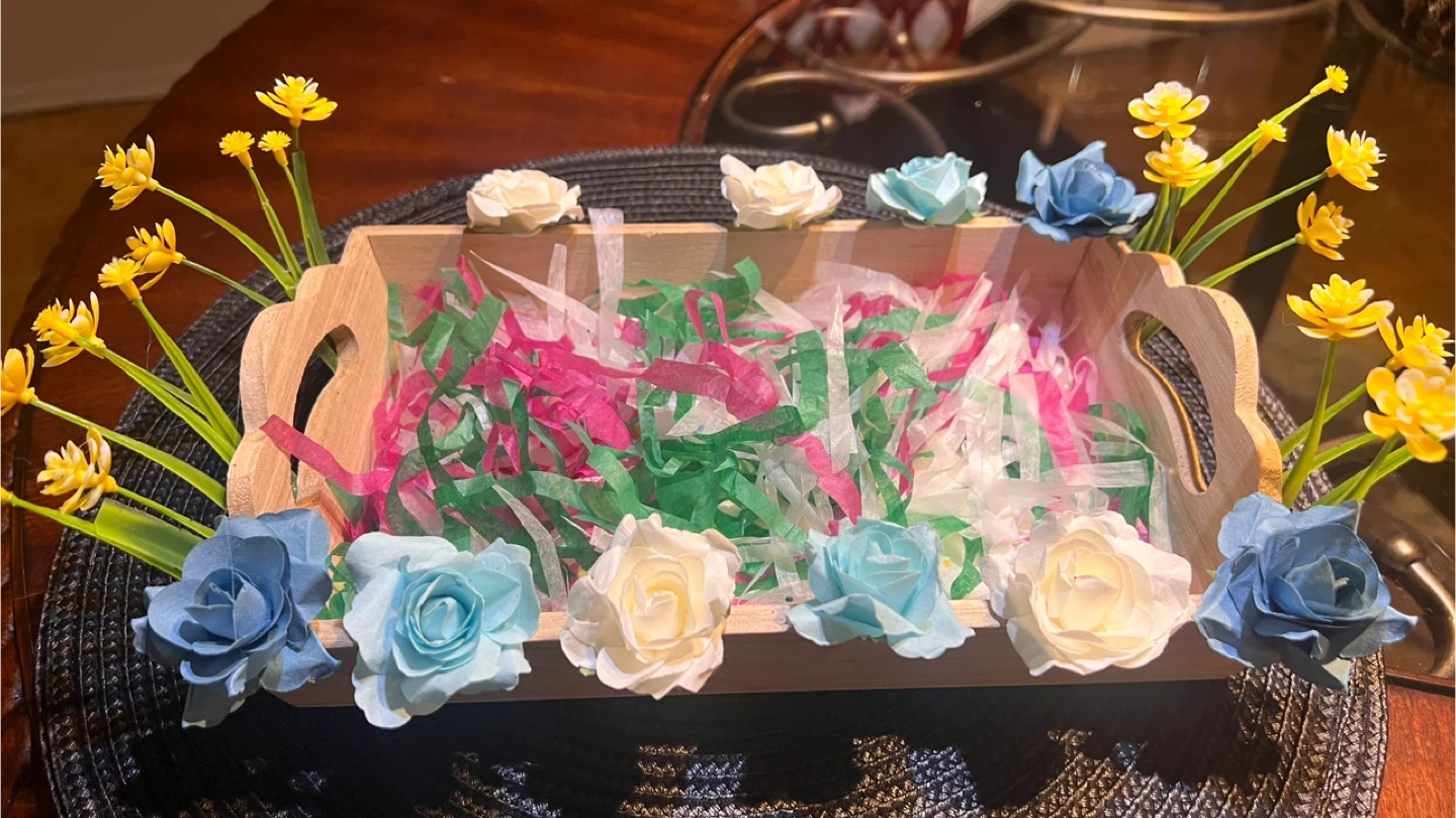 This wooden tray is decorated with artificial flowers and filled with colourful shredded paper. It's perfect for Easter egg hunts or as a decorative centrepiece. Home-made and used last Easter.