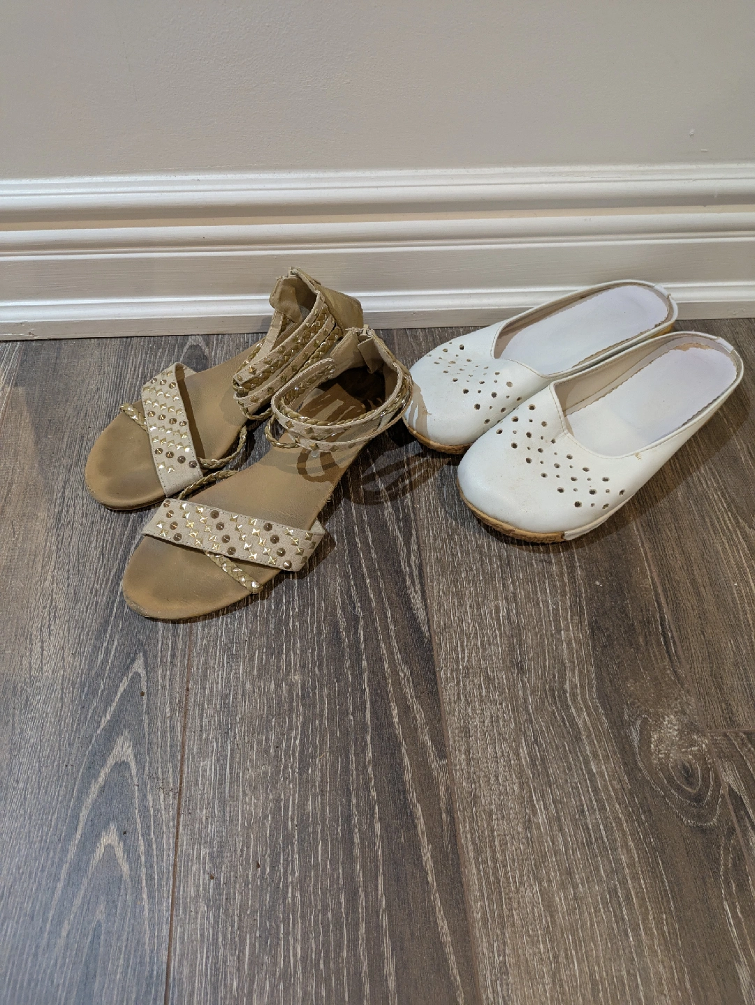 A pair of sandals and a pair of mules. The sandals are a light tan colour with gold studs. The mules are white with a perforated design.
