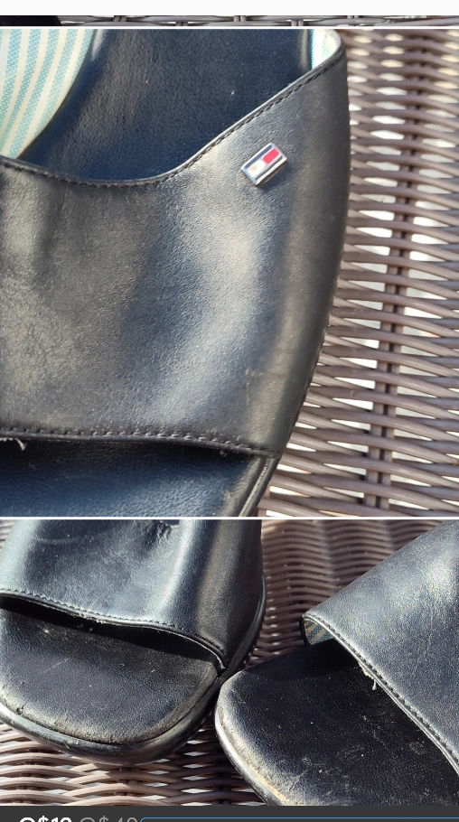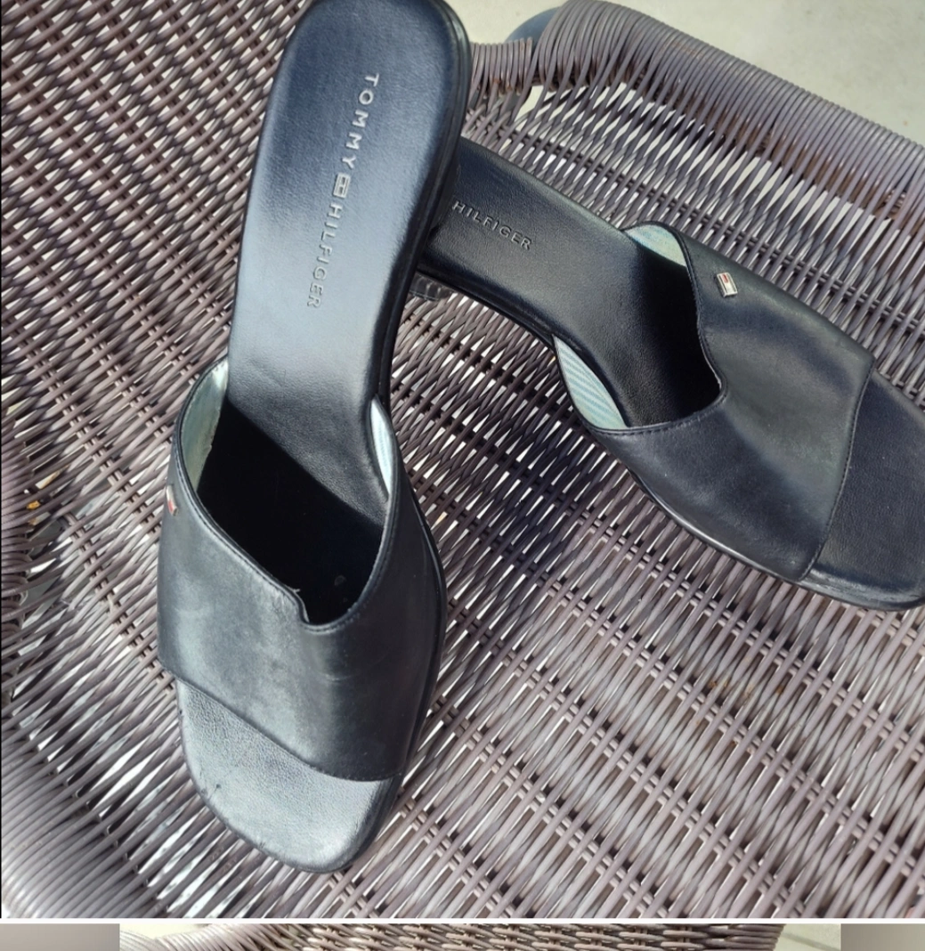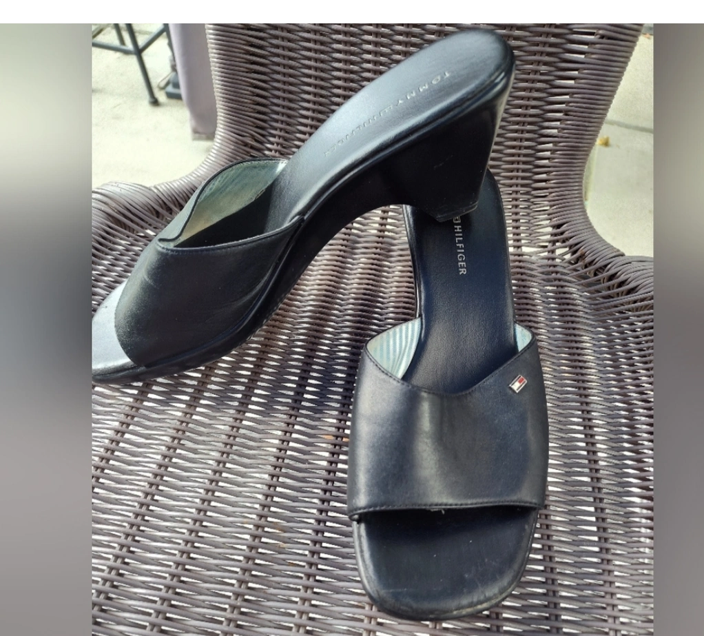 75Tommy Hilfiger open toe sandals 3 inch heel with leather uppers in good condition with a little wear on both toes(see pic) does not affect the usage. NS, small dog home.