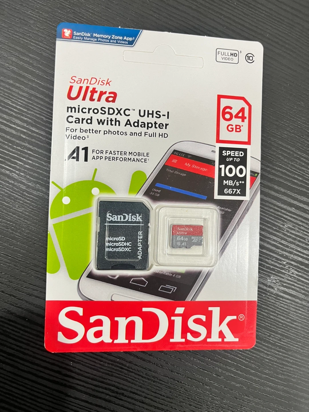 Selling a SanDisk Ultra 64GB microSDXC UHS-I Card with Adapter! It's perfect for expanding storage for photos and full HD video recording. - 64GB storage capacity - Up to 100MB/s read speed - Includes adapter - Ideal for smartphones, tablets, and cameras