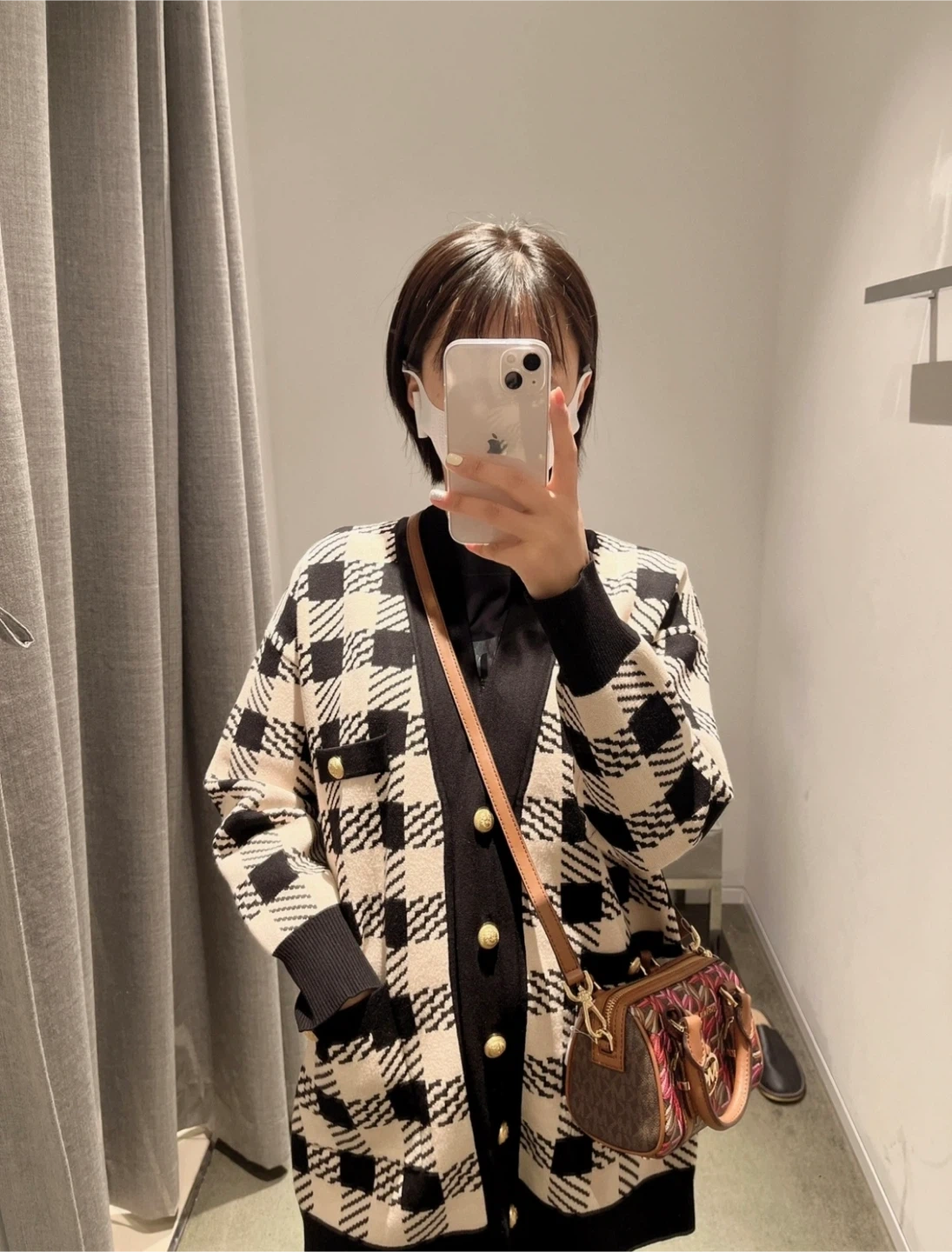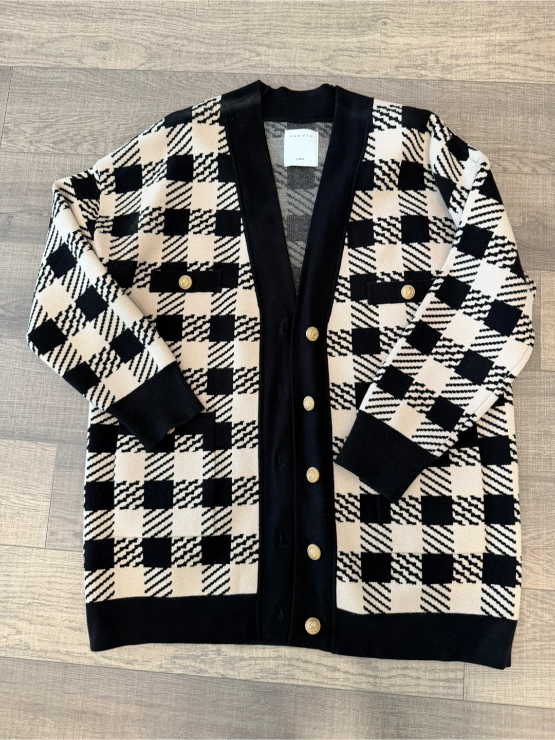 208This Sandro cardigan is in great condition and features a stylish black and white checkered pattern. It has gold button details and is perfect for layering. The material feels soft and comfortable, making it a great addition to any wardrobe!