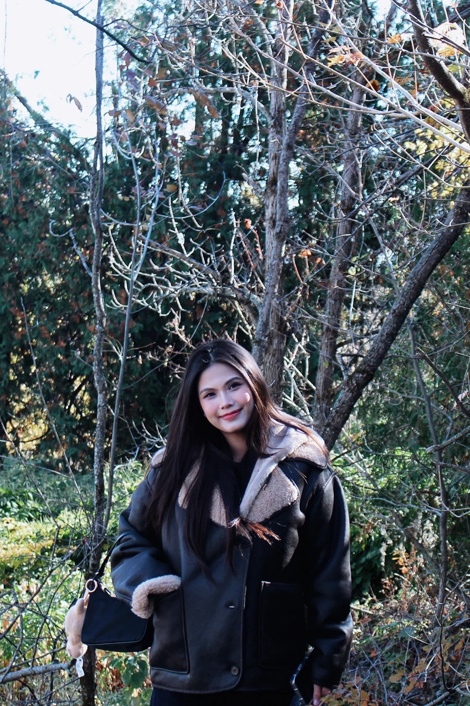 Brown faux leather jacket with a cozy faux shearling lining and collar. It's a stylish and warm outerwear piece perfect for cooler weather.