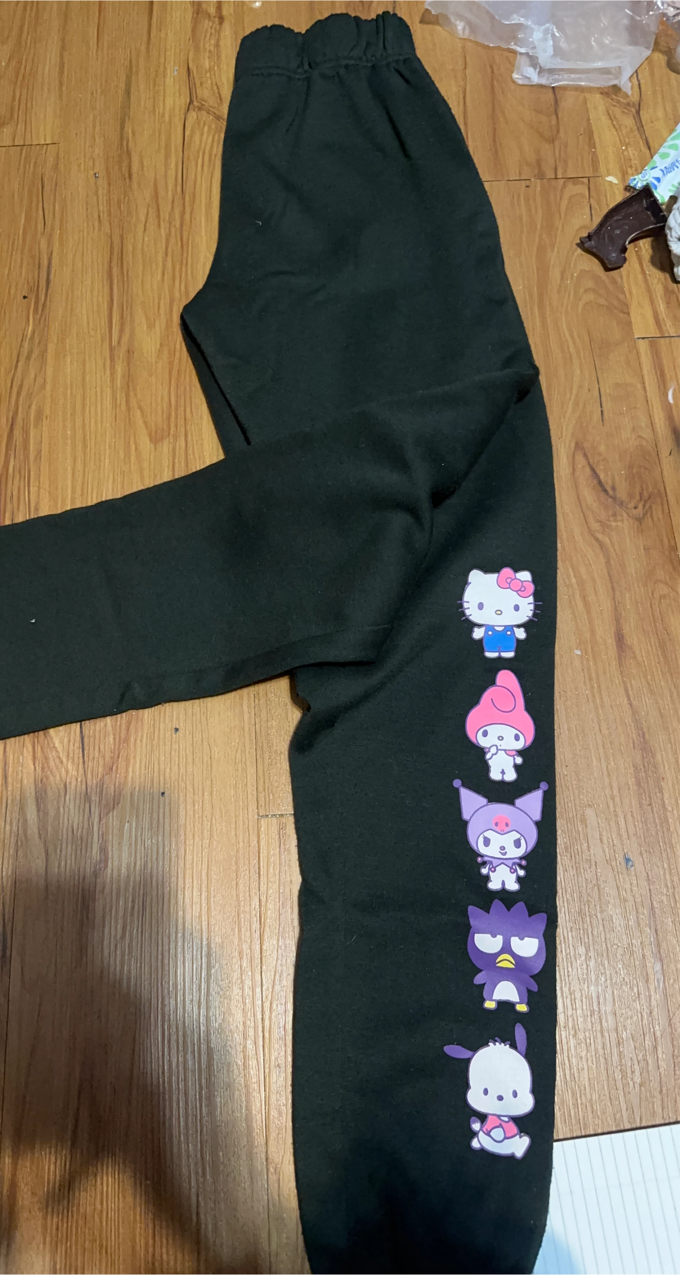10Cute black sweatpants featuring Sanrio characters like Hello Kitty, My Melody, Kuromi, Badtz-Maru, and Pochacco down the side! Great for lounging around the house or adding a bit of fun to your outfit