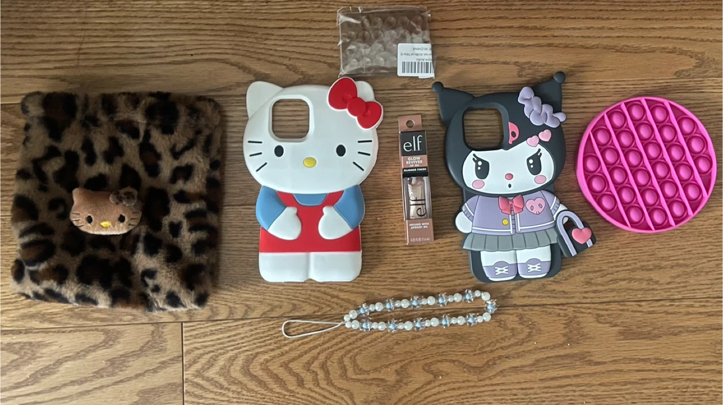 Selling a cute bundle of phone accessories! Included are two adorable (iPhone 12 pro Max) phone cases featuring Hello Kitty and Kuromi, a leopard print pouch with a Hello Kitty accent, a beaded phone strap, 2 octobuddies, a pink pop-it, and an e.l.f. Glow Reviver Lip Oil in Glimmering Finish that is completely brand new! Available for pick-up, selling everything for a total of $10