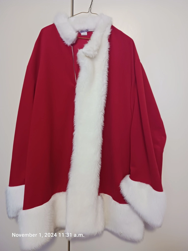 Santa Claus costume includes jacket, pants, and wig. White fur trim. reading glasses. gloves and trim for your boots. X-Large size. ITS MISSING THE HAT Dry cleaned. Great for office parties or family events.