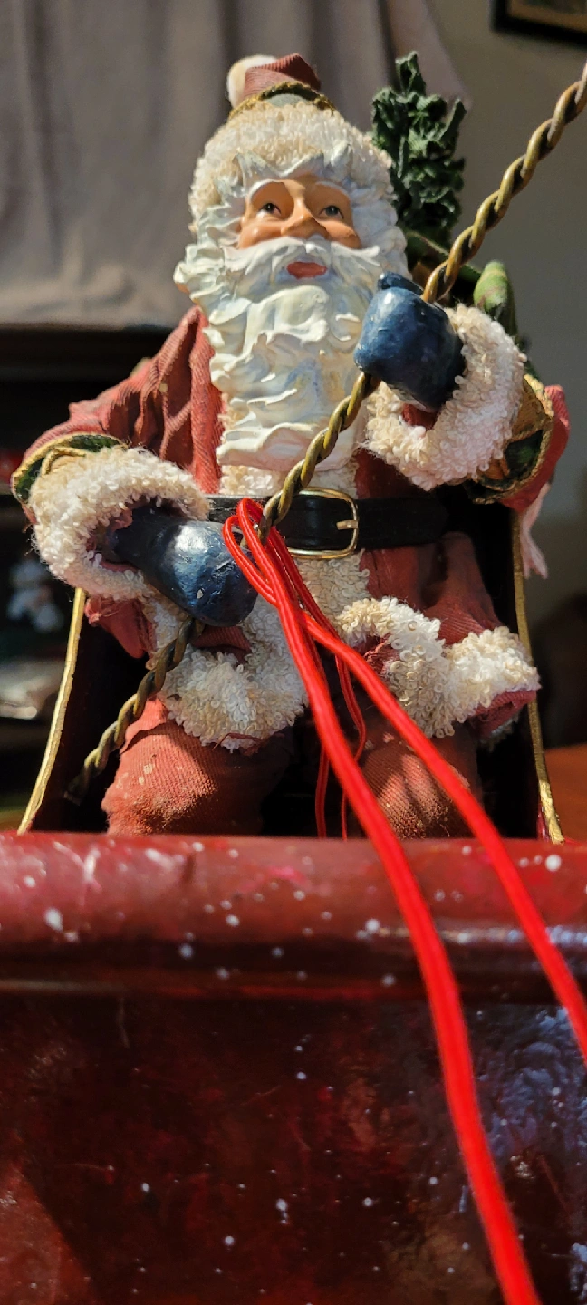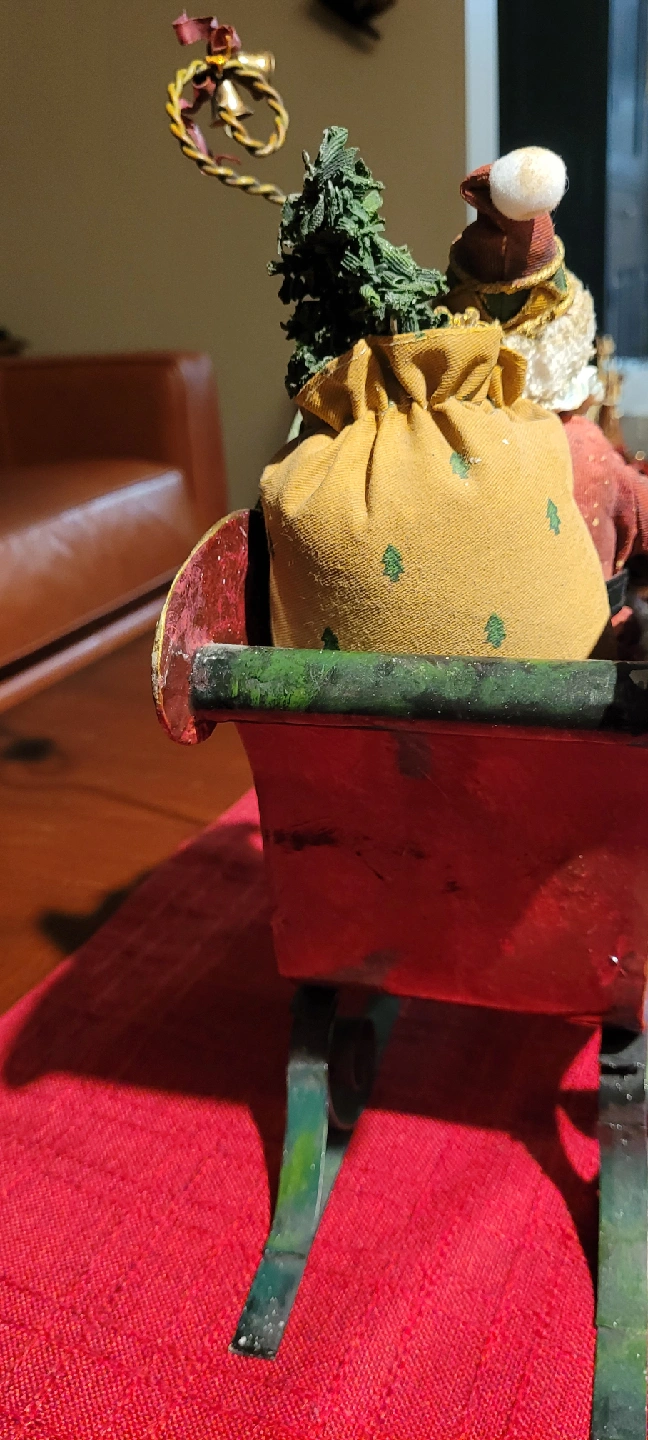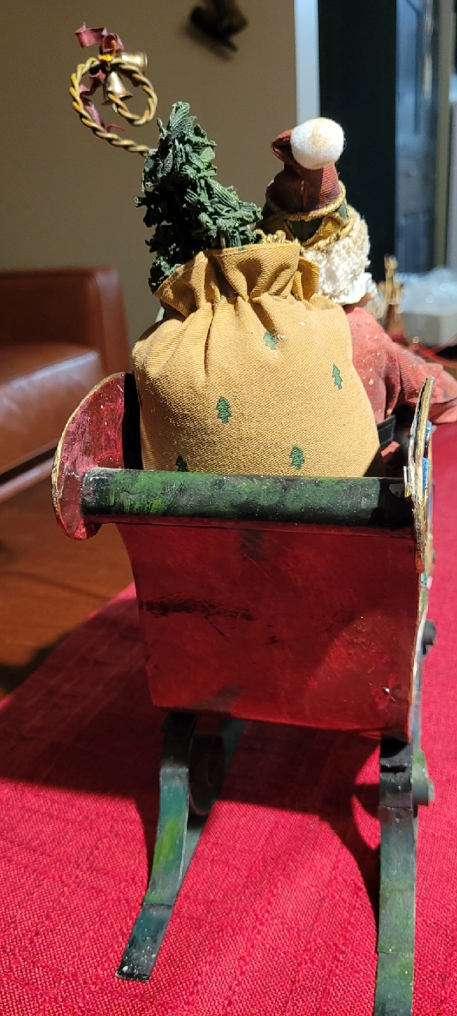 37Beautiful vintage Santa with 3 reindeer. Metal sleigh with Santa sitting inside- approx 14"L x 12"H x 5" W (plus staff) Resin reindeer with metal antlers- approx 6.5"L x 9" H x 3" W Lovely painted scene on both sides of metal sleigh. Santa is made of starched fabric. Note small chip on ear & tail of 1 reindeer. Comes in box with formed styrofoam inserts for each piece for storage.