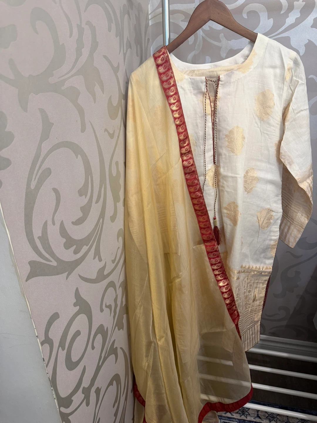Cream coloured kurti with gold woven pattern all over. It features a contrasting gold patterned border at the hem and cuffs. A sheer yellow dupatta with red and gold trim is included. This outfit is lovely for festive occasions!