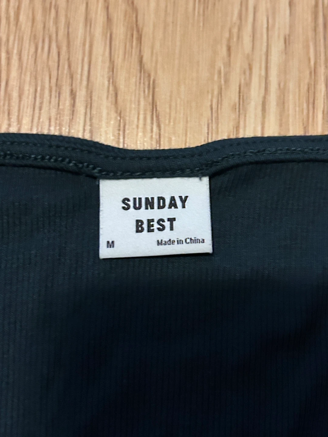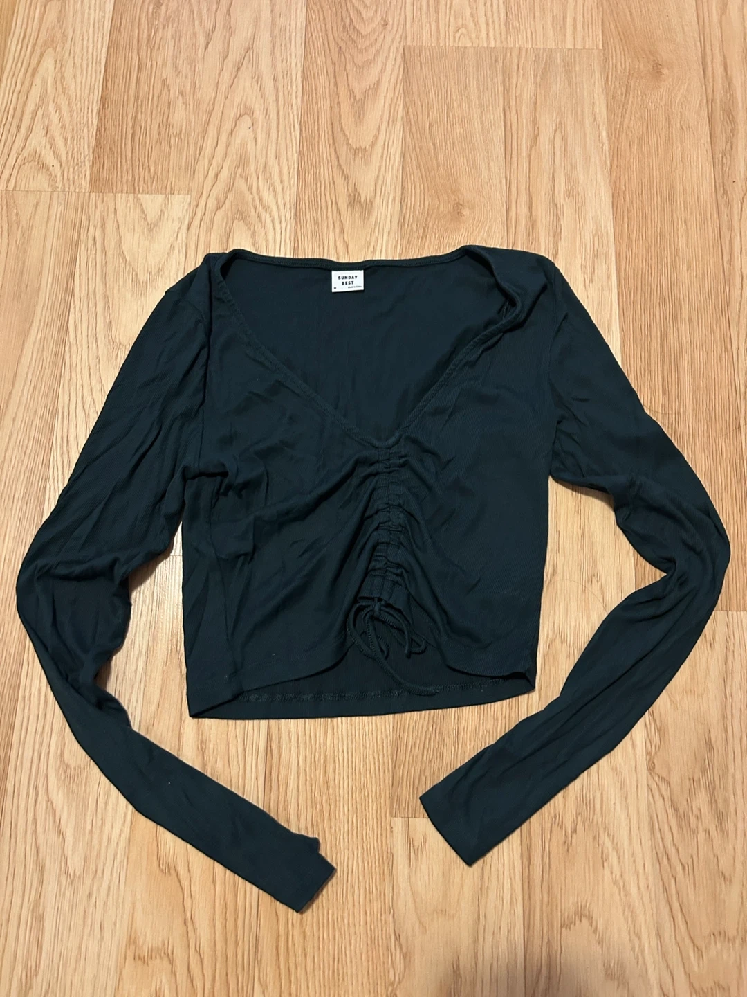 This is an Aritiza long-sleeve crop top in dark green. It's a size medium with a ruched front detail. The material is soft and stretchy.