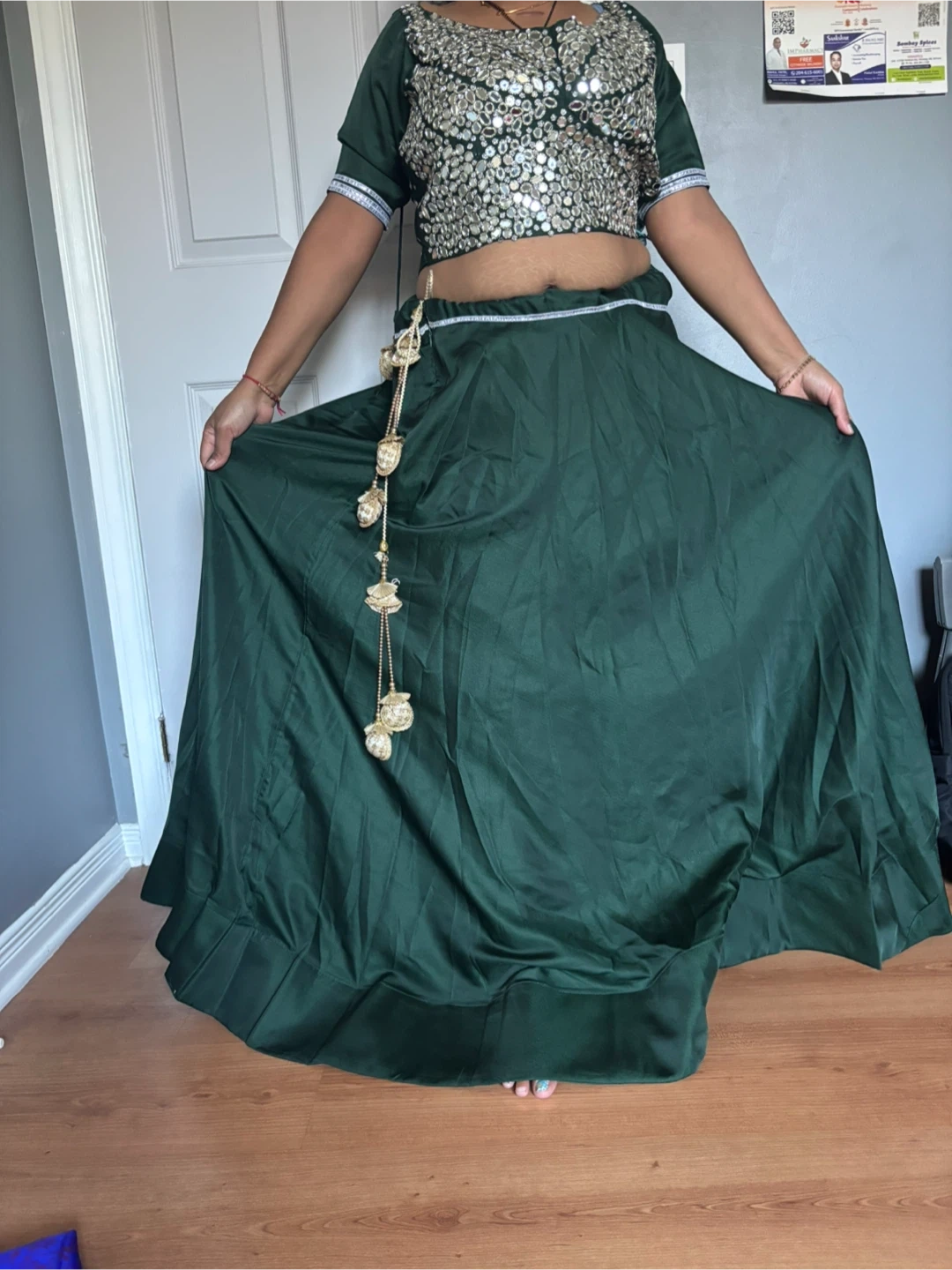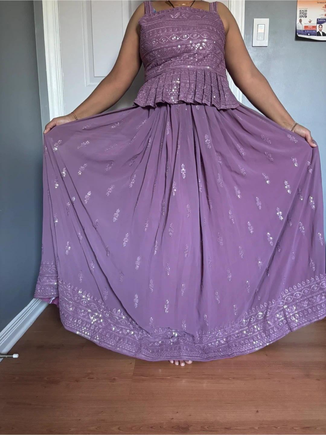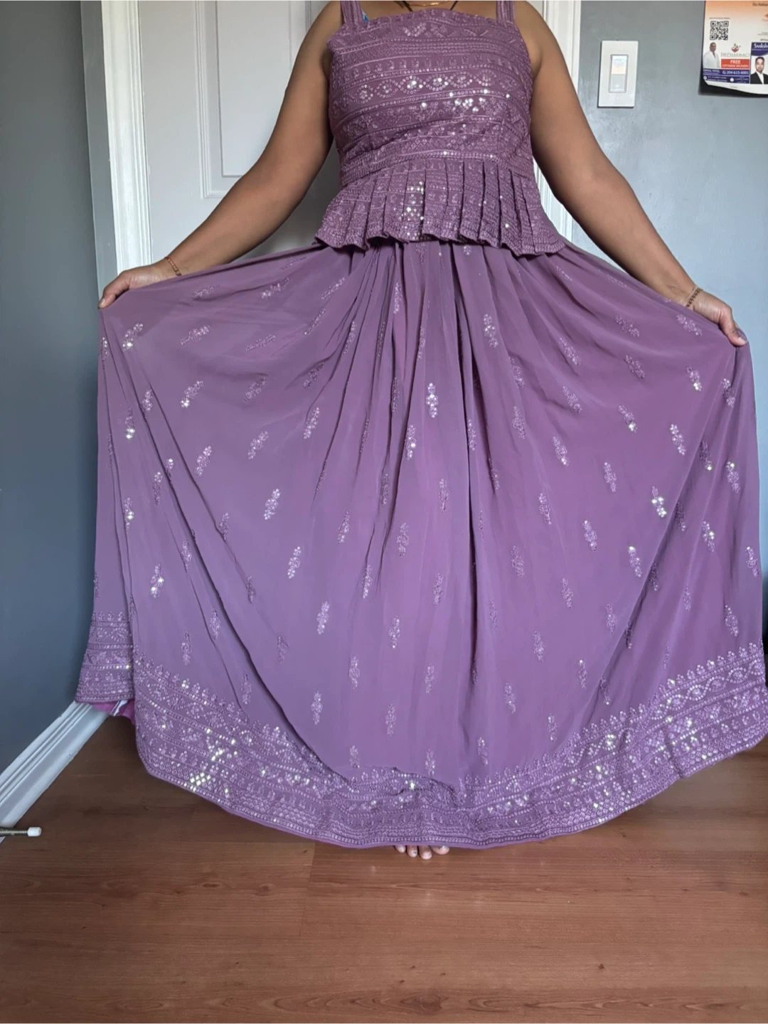 Selling a beautiful saree and lehenga choli set. The saree is a lovely light purple with gold trim and sequins. The lehenga choli is a vibrant mix of colours, perfect for a special occasion!