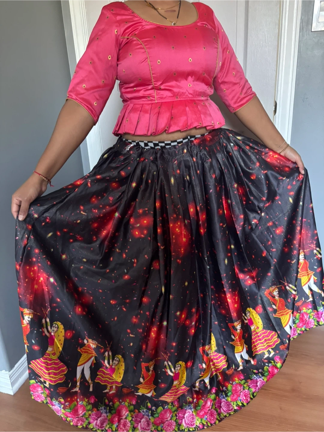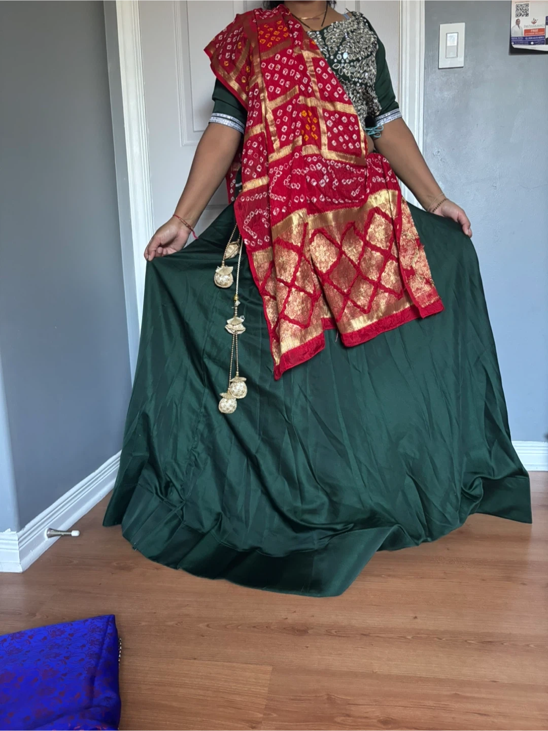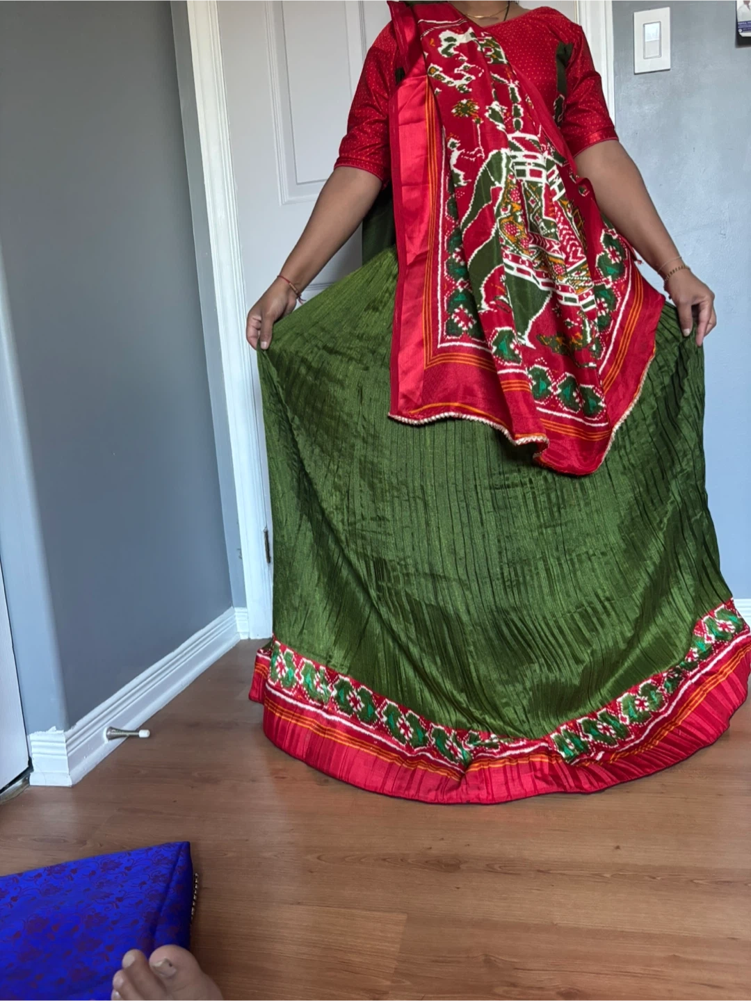Selling a beautiful saree and lehenga choli set. The saree is a lovely light purple with gold trim and sequins. The lehenga choli is a vibrant mix of colours, perfect for a special occasion!