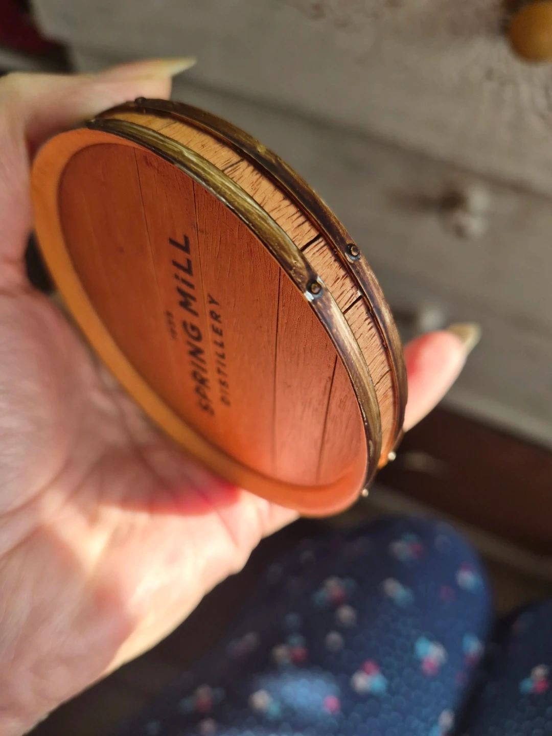 These are Spring Mill Distillery barrel top coasters. They're designed to look like wood barrel tops. Perfect for protecting surfaces from drinks!