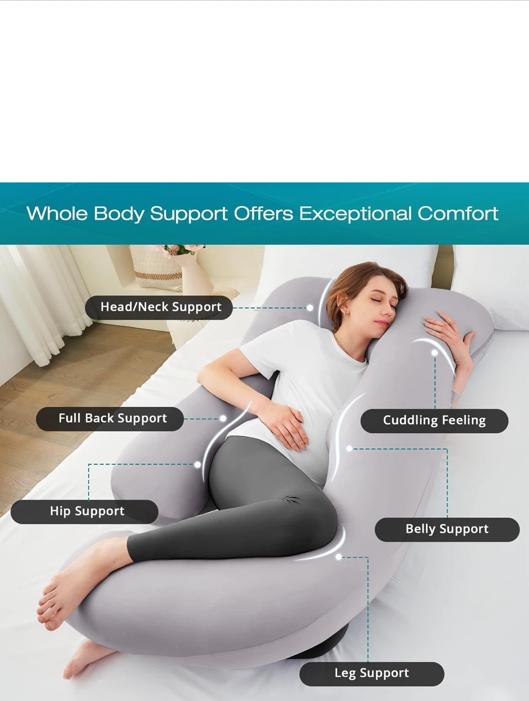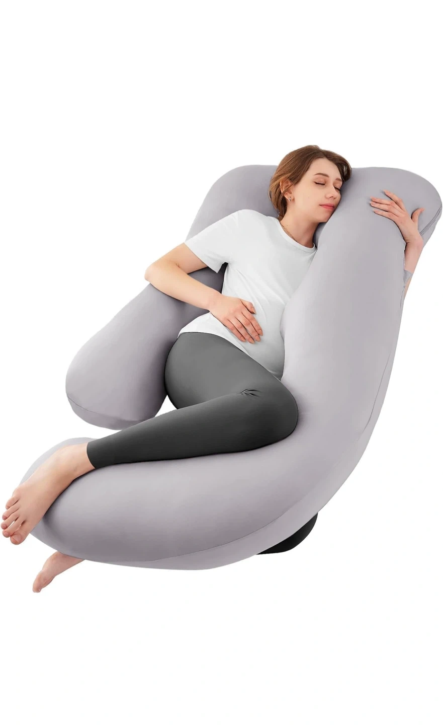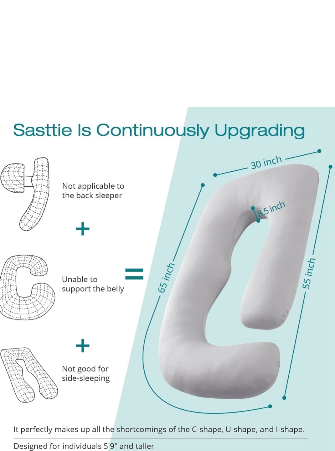 This Sassttie full body pillow is designed to provide exceptional comfort and support during pregnancy. It offers whole body support, including head/neck, full back, hip, belly, and leg support. Key features: - Dimensions: 65 inch x 30 inch x 8.5 inch - Designed for individuals 5'9" and taller - Provides a cuddling feeling for side-sleeping - Offers exceptional comfort